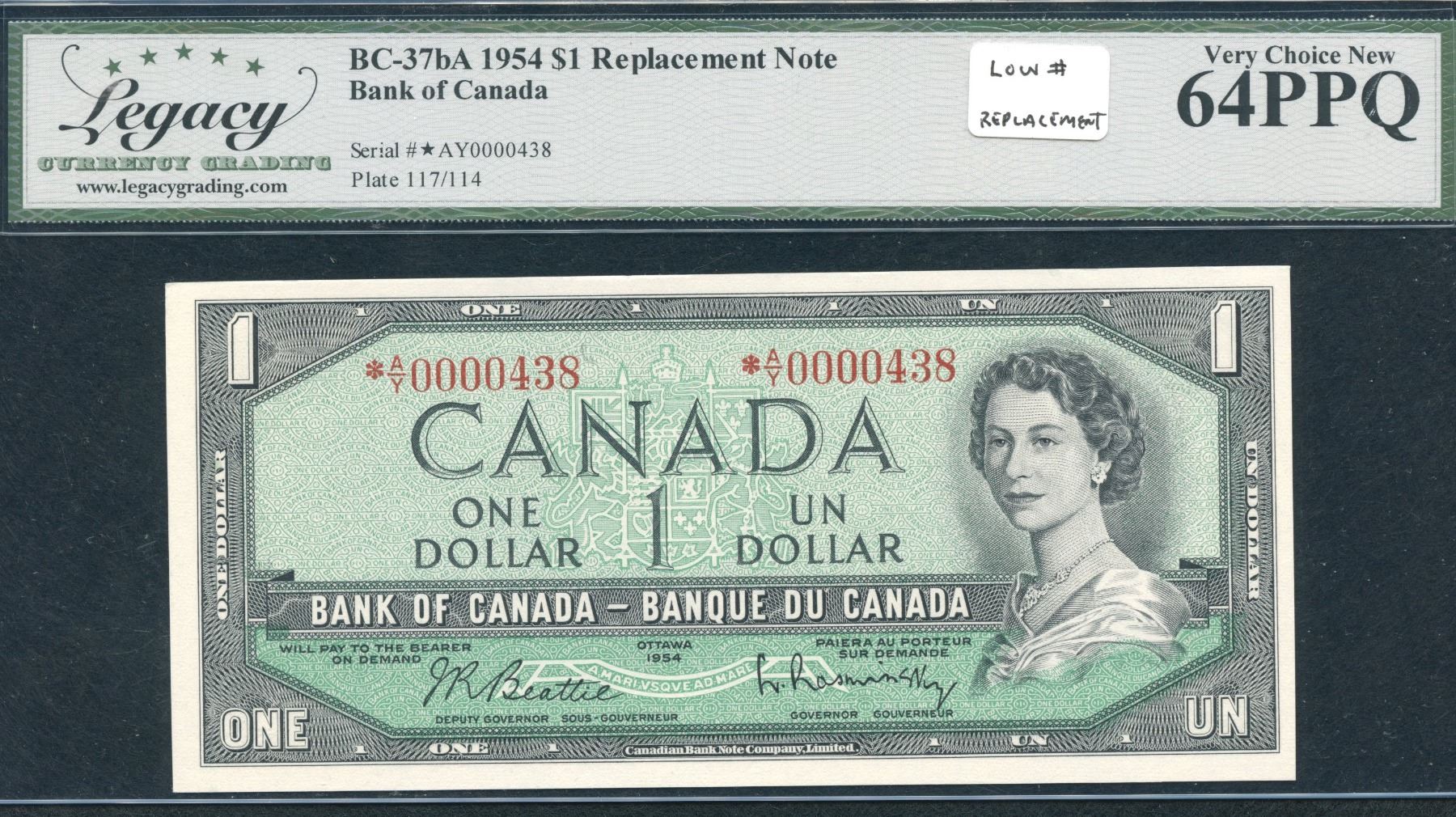 BC-37bA-N5-iv. Legacy Very Choice New 64PPQ. Beattie-Rasminsky. A rare find being a replacement and low numbered note. S/N:*A/Y0000438