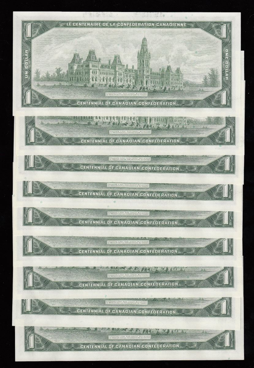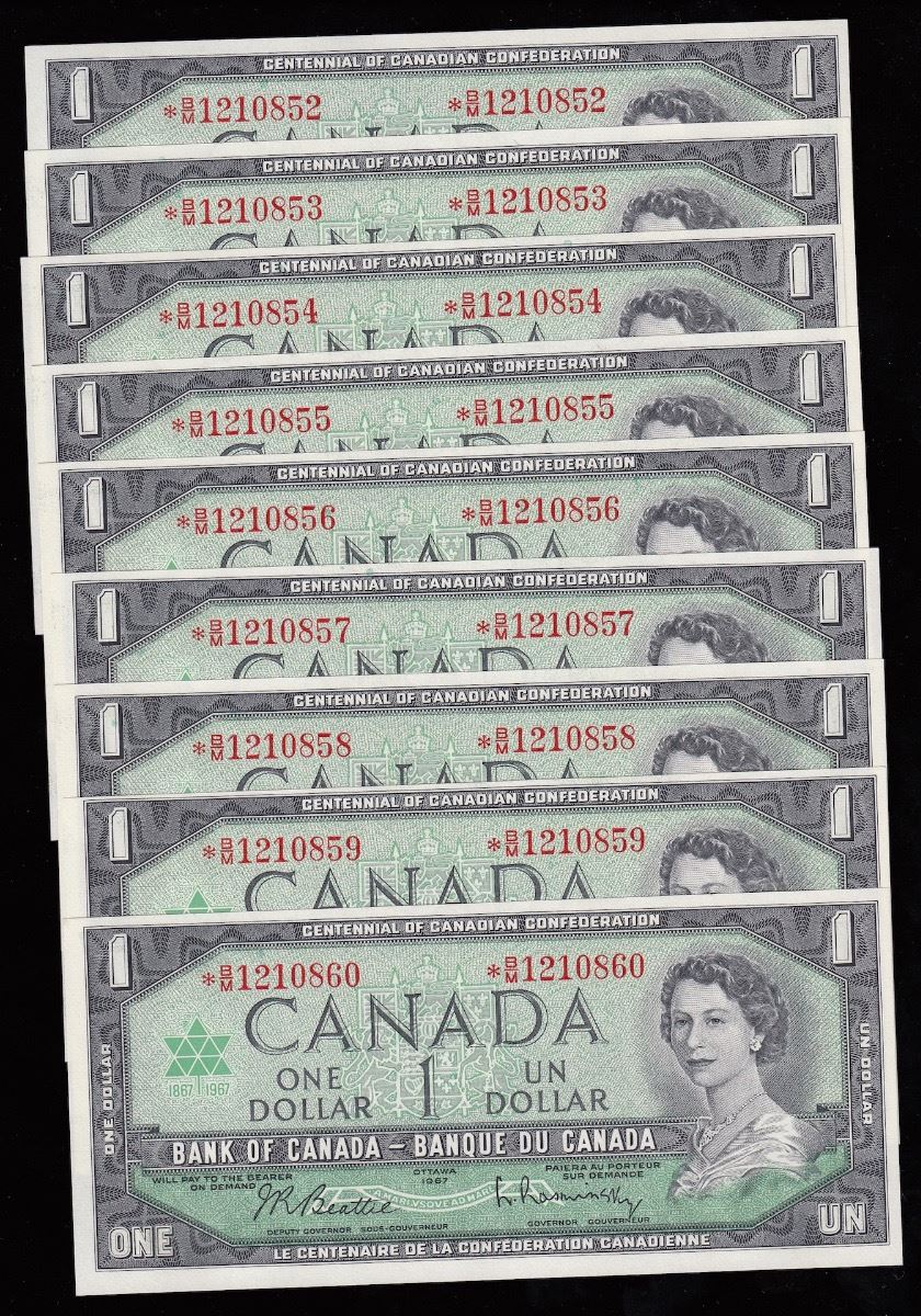 Bank of Canada $1, 1967 - Lot of 9 Consecutive Replacement Notes - BC-45bA-i. Nice choice unc's. S/N: *B/M1210852 - *B/M1210860. 9 Pcs.
