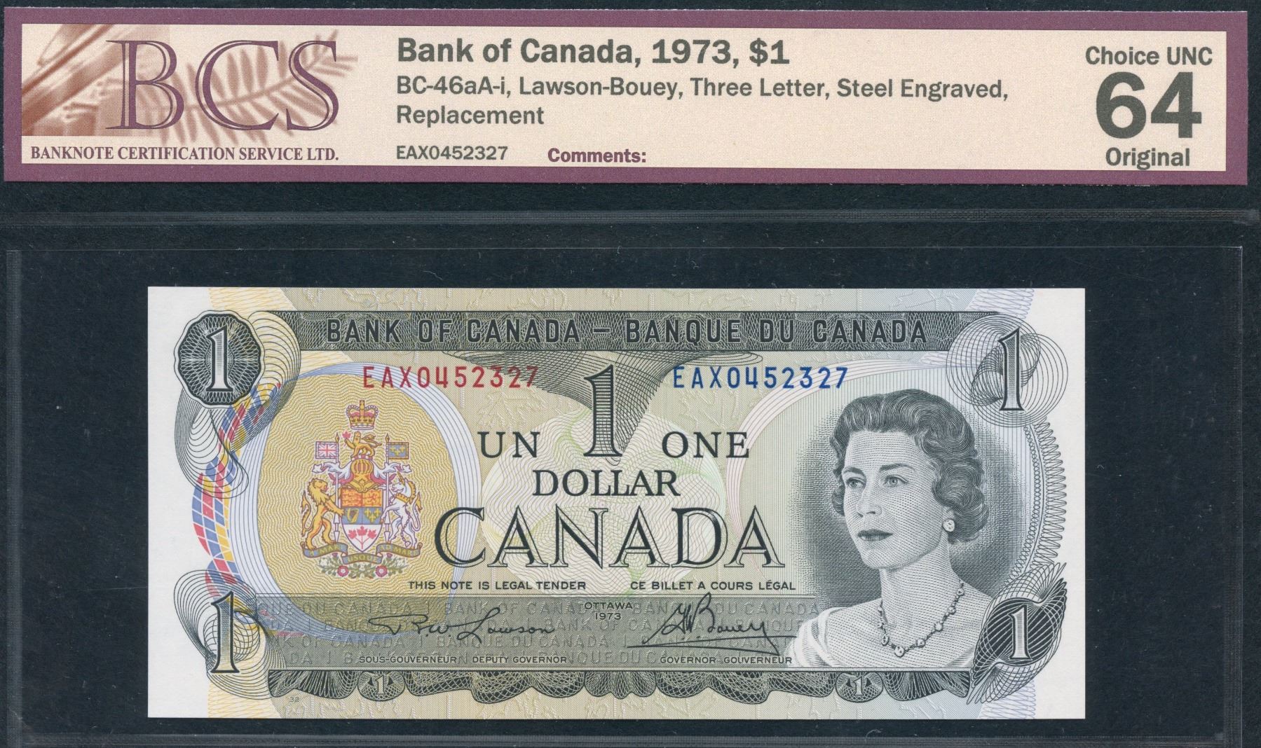 BC- 46aA-i. BCS Chocie UNC 64 Original. Lawson-Bouey. EAX Steel Engraved Replacement. S/N:EAX0452327