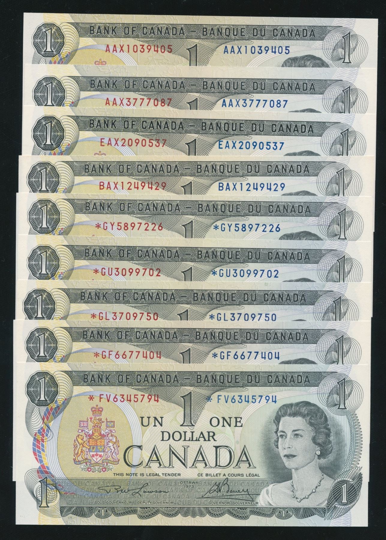 All Unc. Different prefixes, a great addition to the lot below. 9 pcs.
