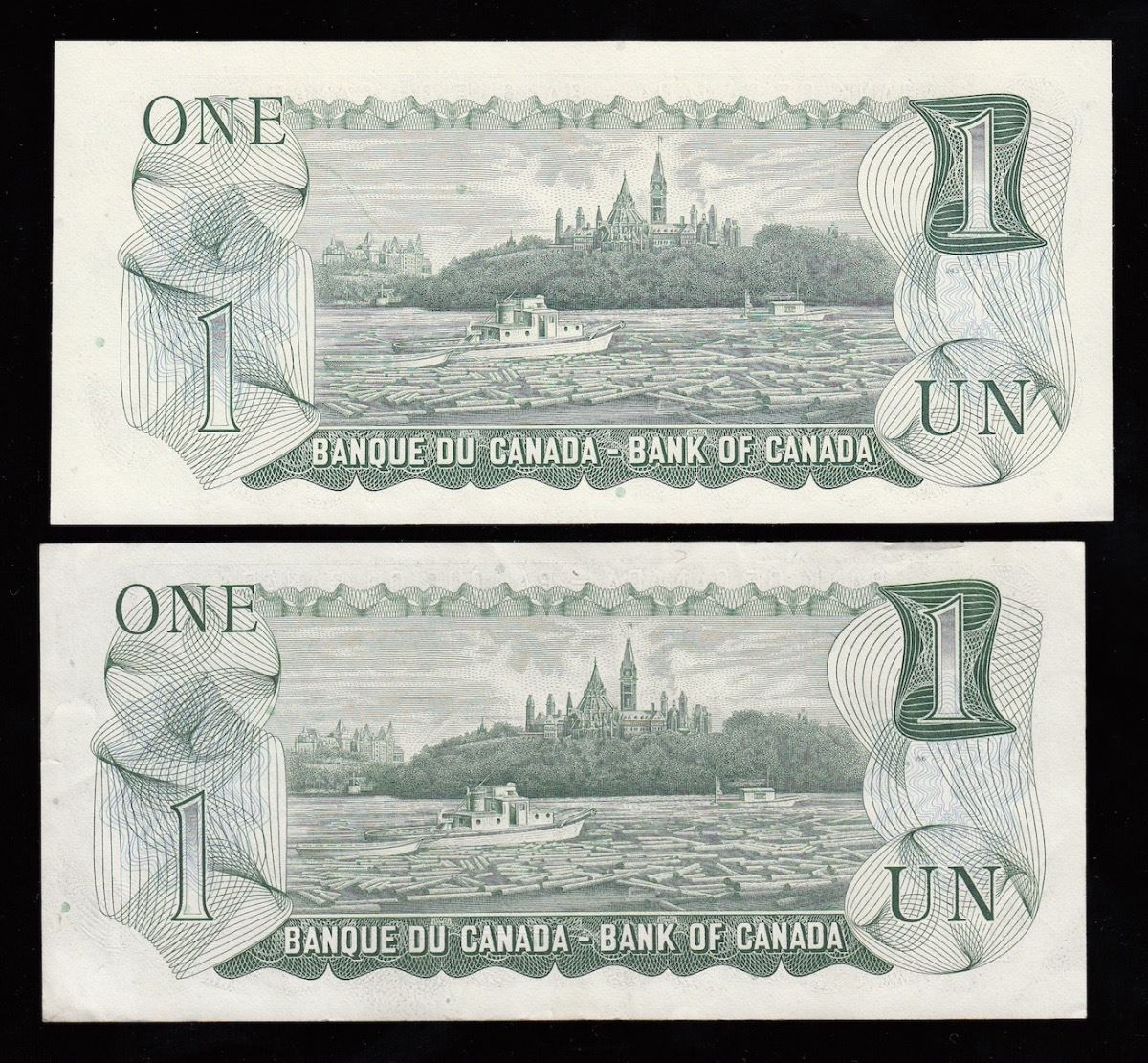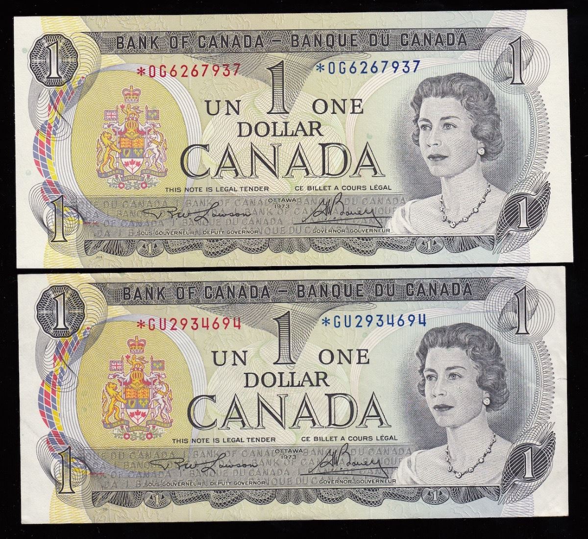 Bank of Canada $1, 1973 - Lot of Two Replacement Notes - BC-46aA. AU, S/N: *OG6267937. EF, S/N: *GU2934694. 2 Pcs.