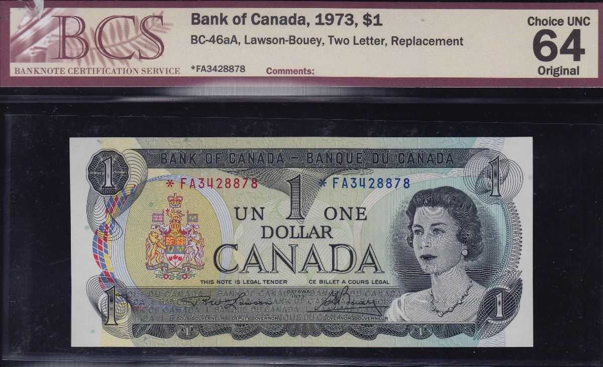 Bank of Canada $1, 1973 - Replacement Note - BCS Choice Unc. 64, original. S/N: *FA3428878.