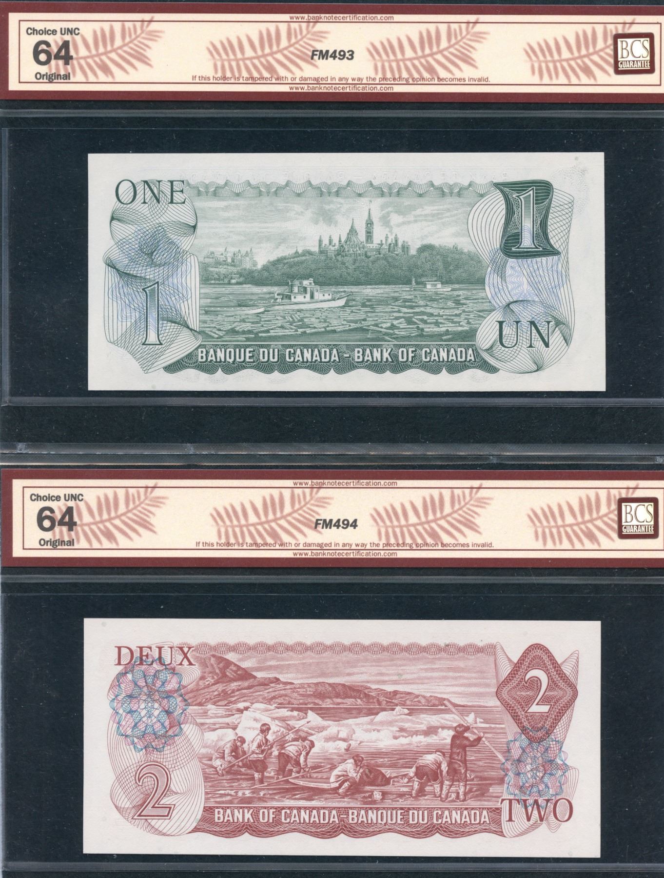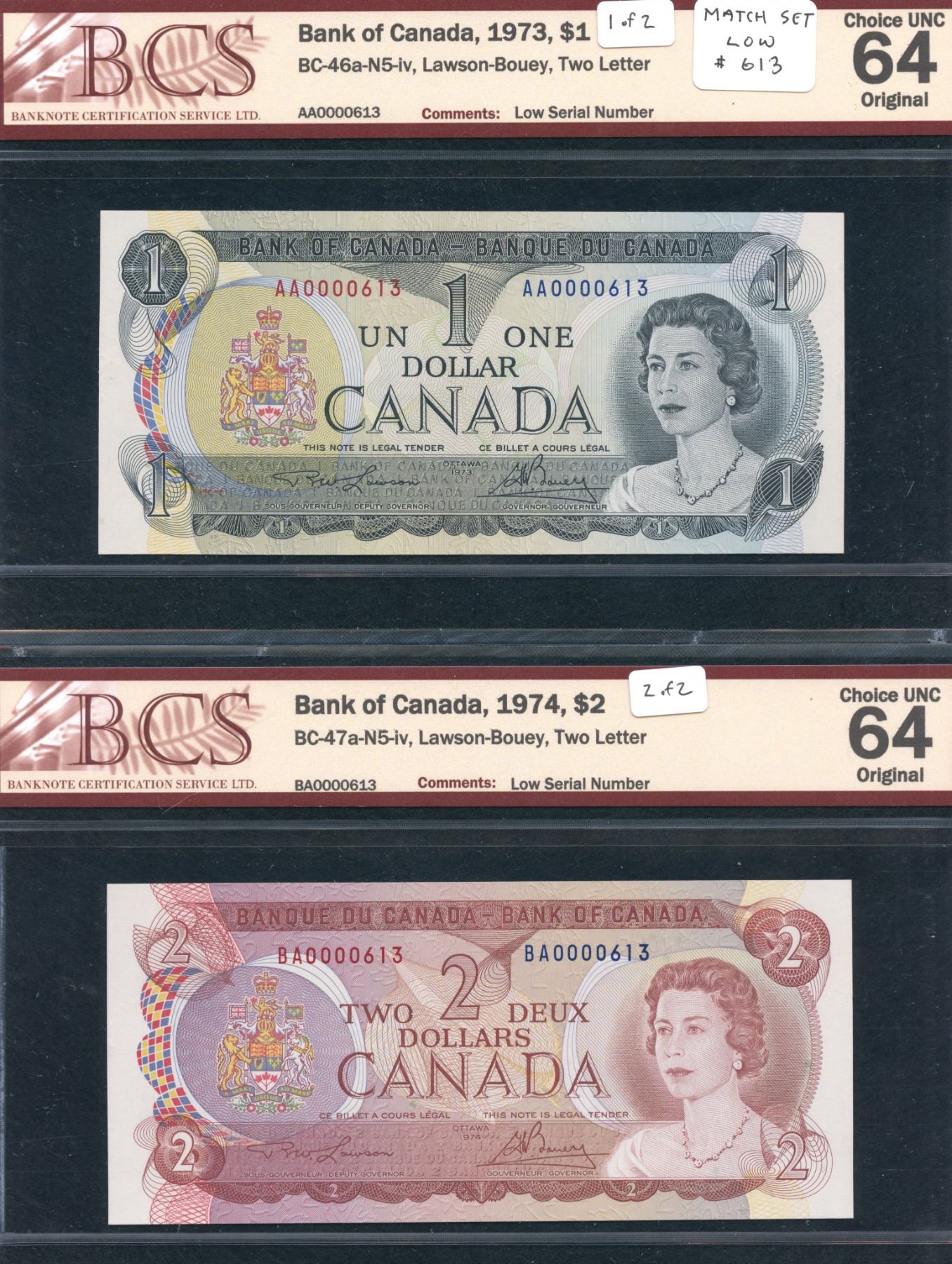 Matching low number set. BCS Choice UNC 64, original. $1 1973 BC-46a-N5-iv & $2 1974 BC-47a-N5-iv. Lawson-Bouey. S/N:AA0000613 & BA0000613. 2 pcs.