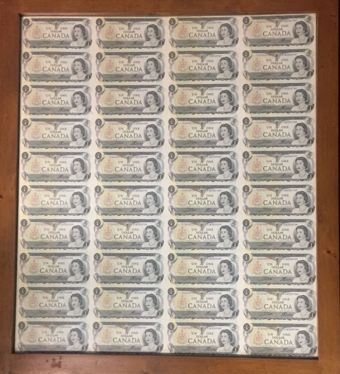 Bank of Canada $1 Notes, 1973 - Uncut Sheet of 40 - Framed, please inspect, no return.