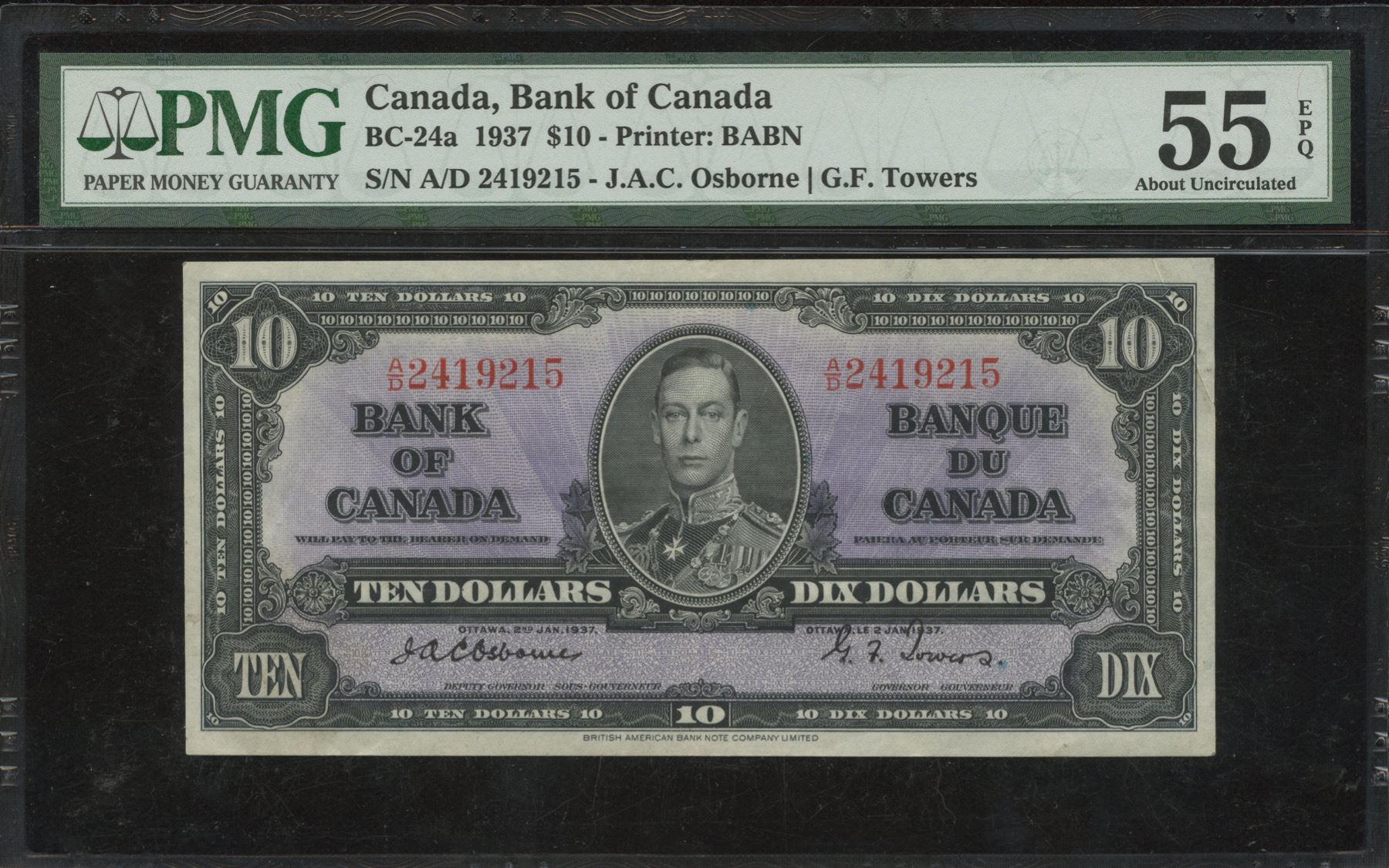 BC-24a. Rare Osborne signature. PMG AU55, EPQ. S/N: A/D2419215.