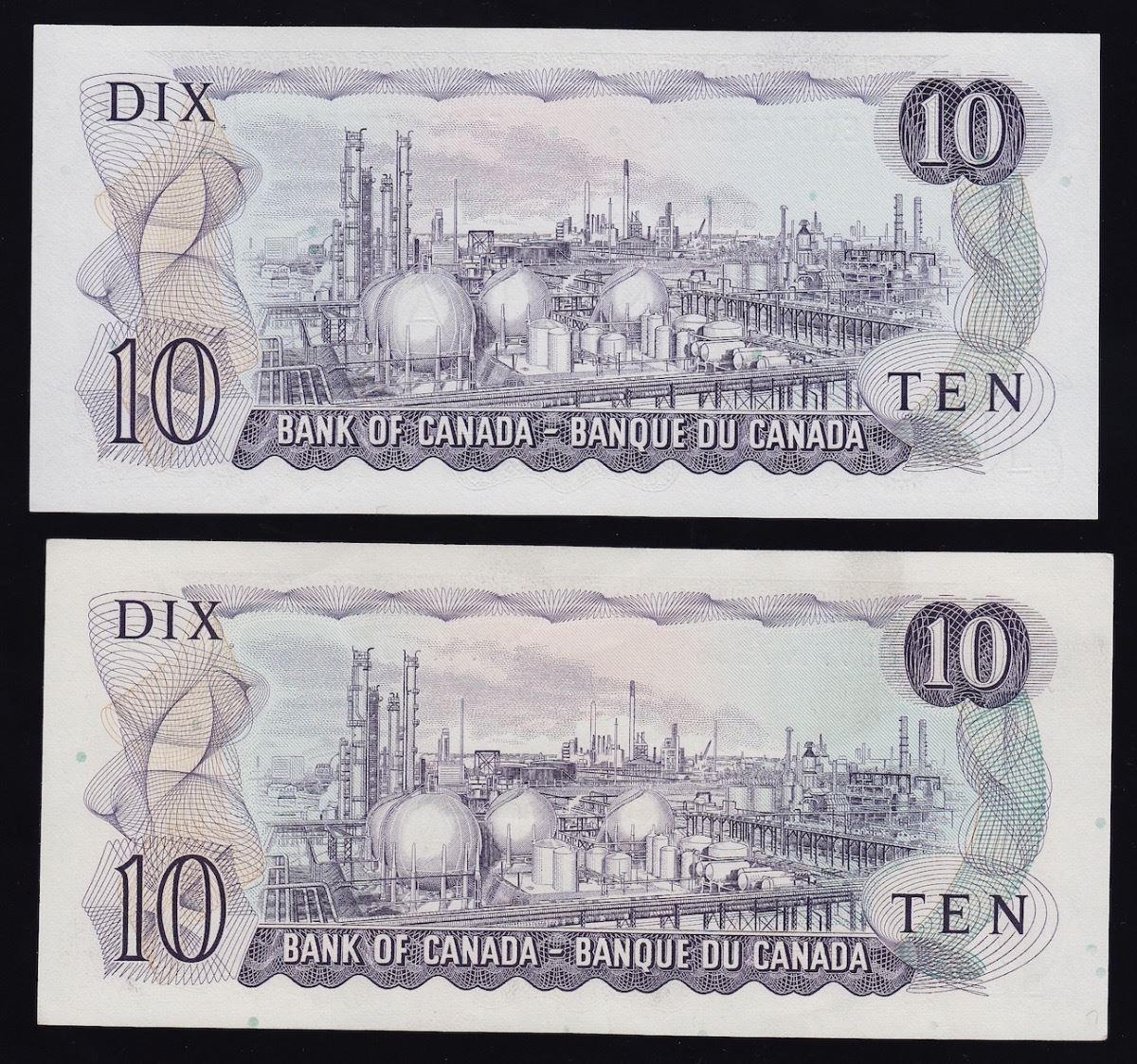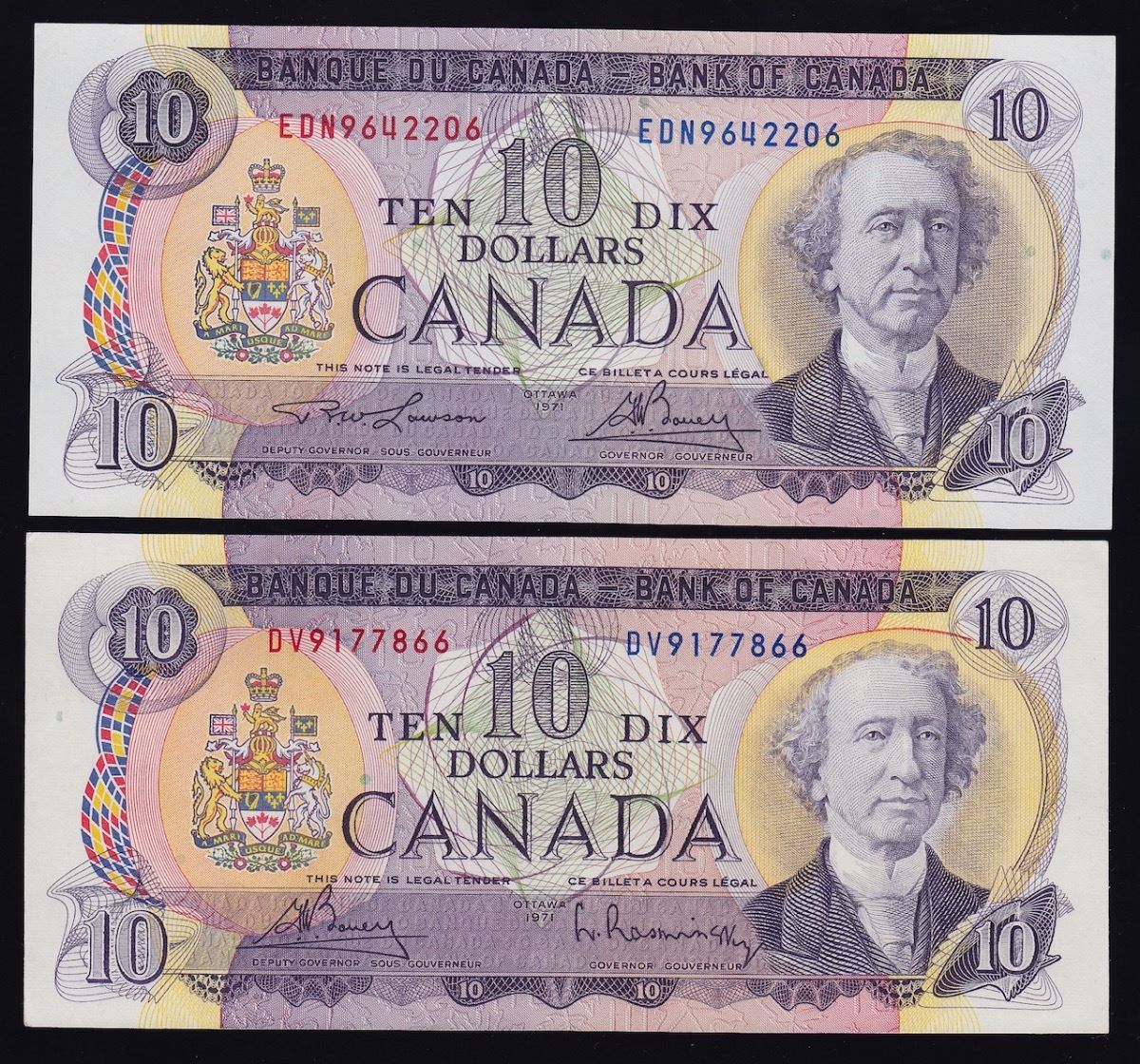 Bank of Canada $10, 1971 - Lot of Two - Includes: 49b, nice EF. 49c-i, Unc. 2 Pcs.