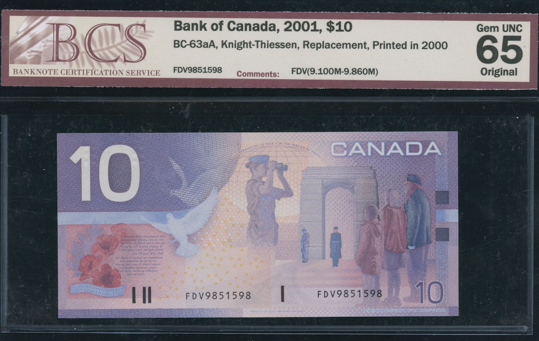 BC-63aA. BCS Gem UNC 65 Original, Knight-Thiessen Printed in 2000, Replacement FDV(9.100M-9.860M) S/N: FDV9851598