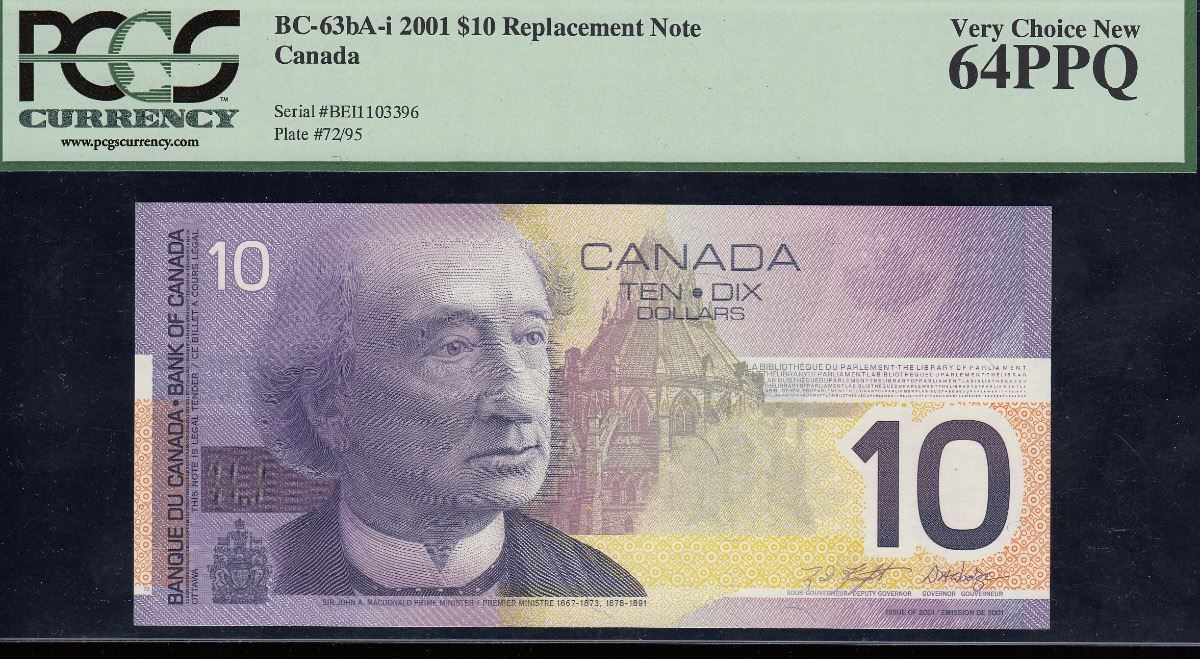 Bank of Canada $10 Replacement, 2001 - CH BC-63bA-i. PCGS Very Choice New 64 PPQ. S/N: BEI1103396.