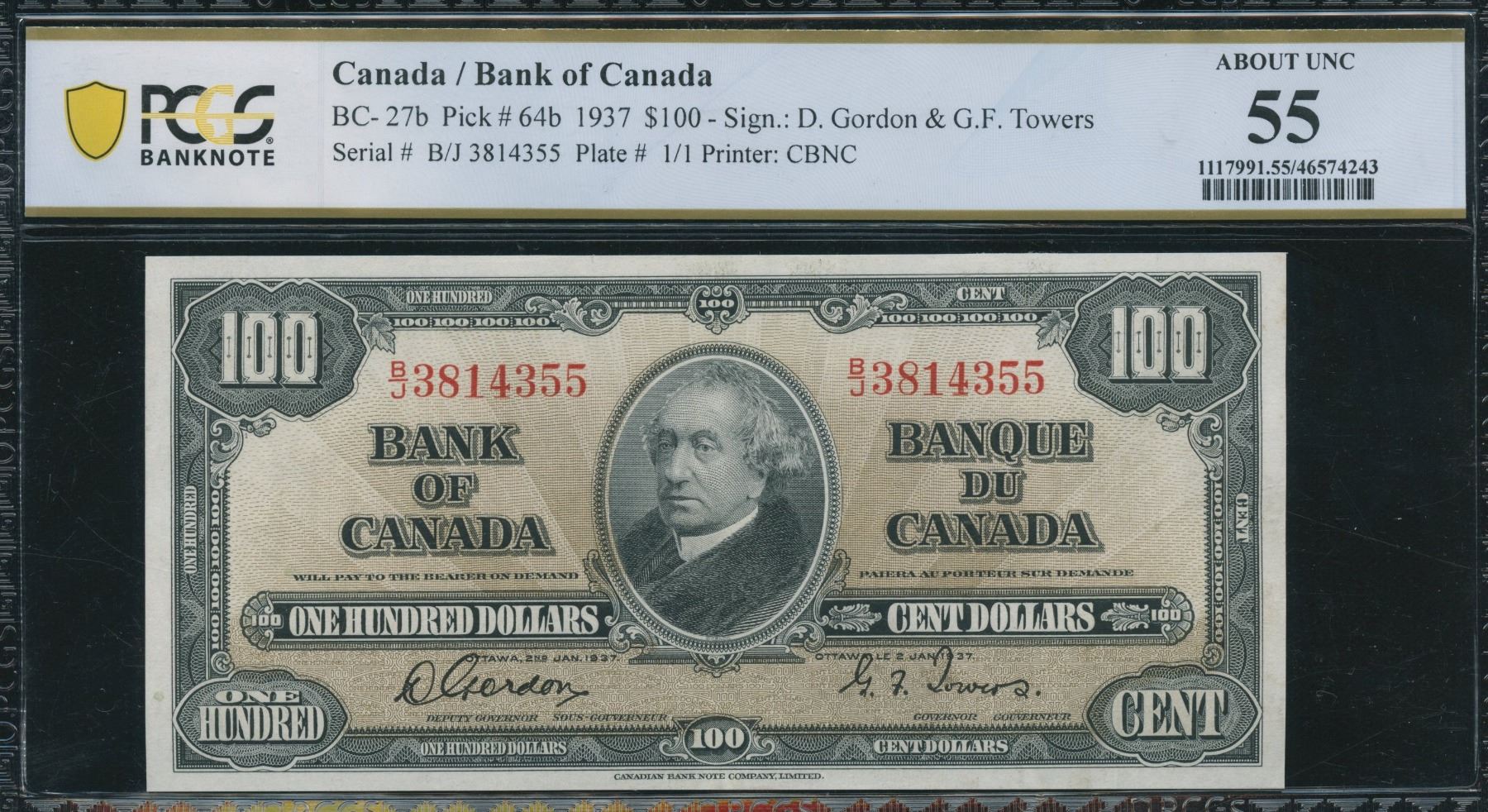 BC-27b. PCGS AU55. S/N:B/J3814355.