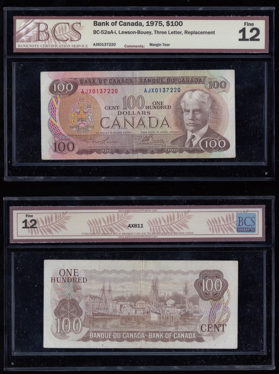 Bank of Canada $100, 1975 - Replacement Note - BC-52aA-I, BCS F-12, margin tear.. S/N: AJX0137220.