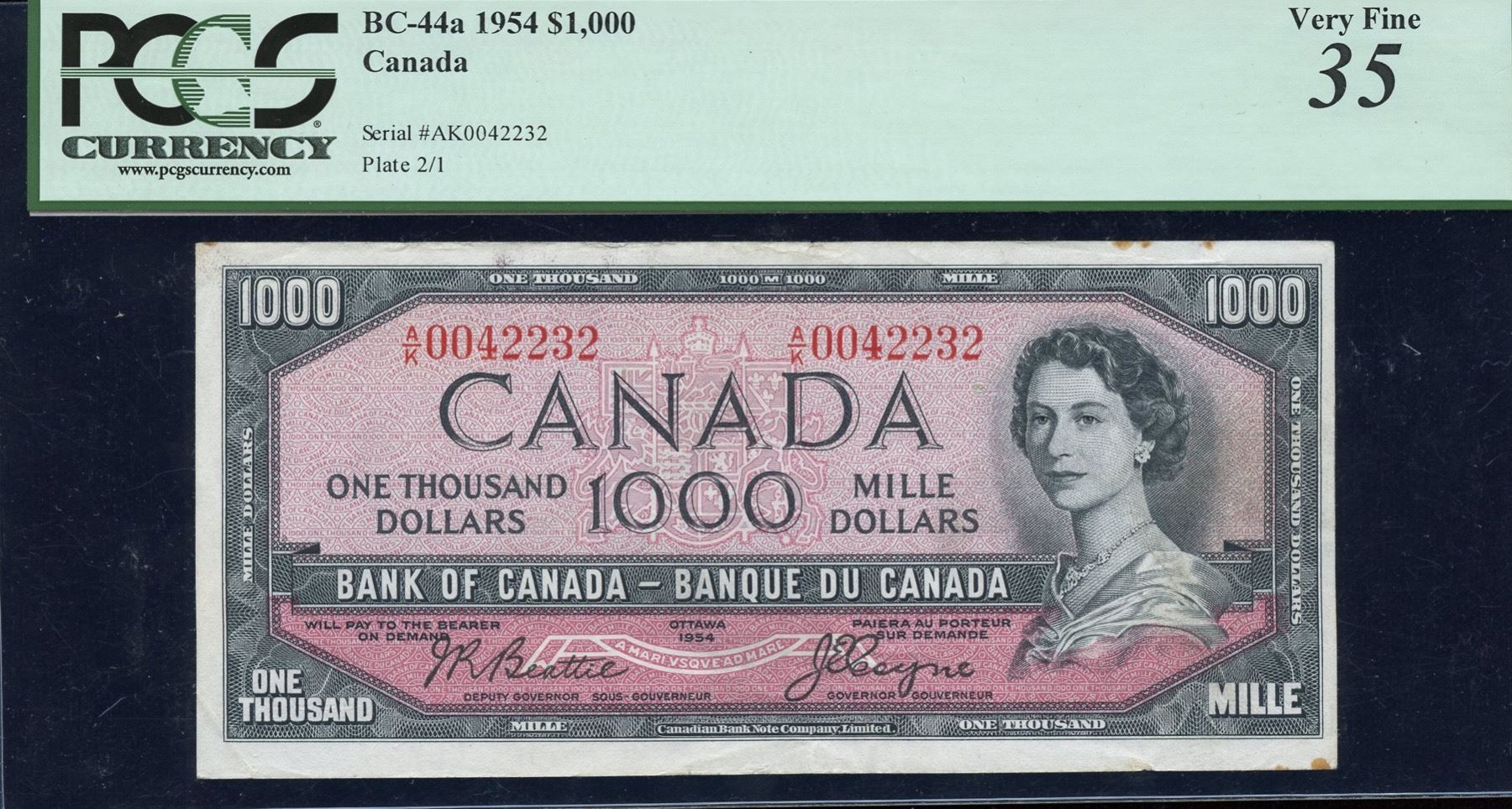 BC-44a. PCGS VF35, minor rust stains. Only 32,000 notes were produced with signature combination of Beattie - Coyne. S/N: A/K0042232.