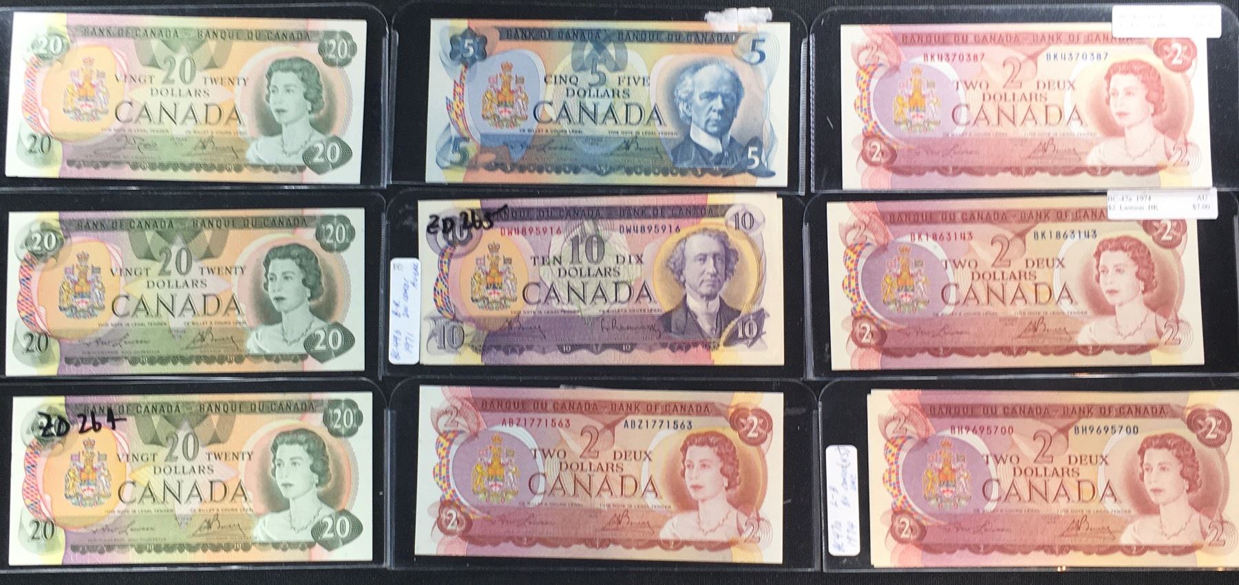 BC-47a 1974 $2 Lawson-Bouey 5 consecutive BH9695700-704 Unc; BC-47a 1974 $2 Lawson-Bouey BK1863143 AU; BC-47a 1974 $2 Lawson-Bouey BK4370387 Au-Unc; BC-47a-I 1974 $2 ABZ1771563 Unc; BC-49a 1971 $10 Bouey-Rasminsky 2 consecutive DW4895916-917 Au-Unc; BC-53a 1979 $5 Lawson-Bouey 30005415623 Unc; BC-54a 1979 $20 Lawson-Bouey 50076331489 AU; BC-54a 1979 $20 Lawson-Bouey 50160099795 AU; BC-54b-i 1979 $20 Crow-Bouey 56263879245 AU. 14 Pcs.