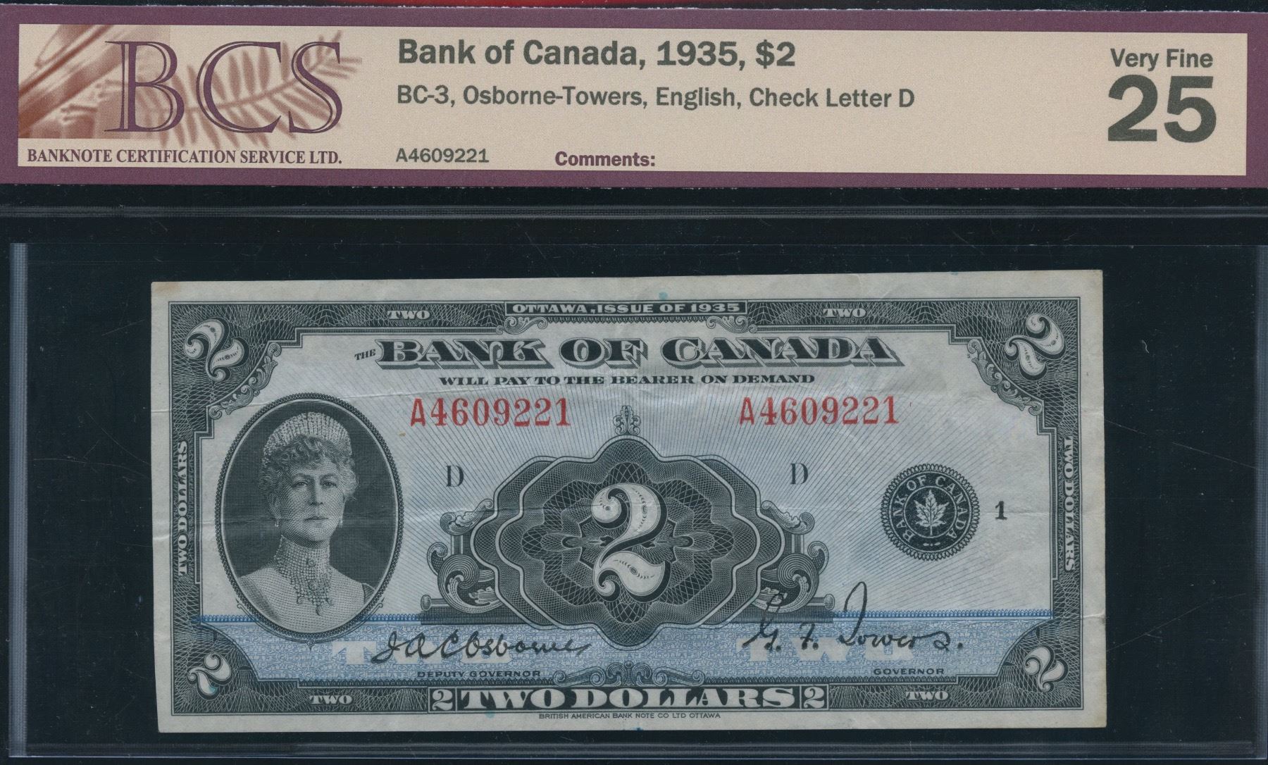 BC-3. BCS Very Fine 25. Consecutive with next lot. S/N: A4609221.