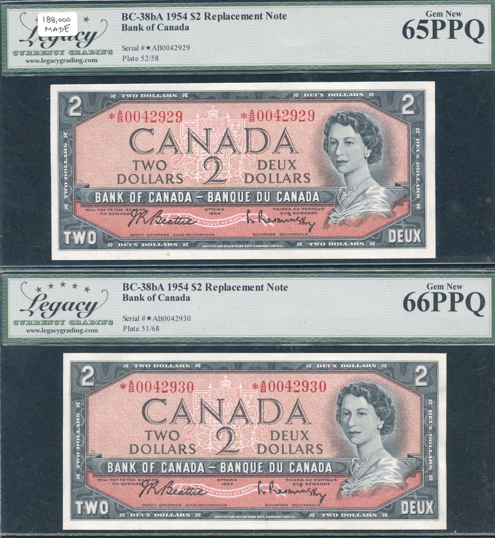 BC-38bA. Legacy Gem New 66 & 65 PPQ. Bettie-Rasminsky. With only 188,000 replacement notes printed, a nice addition to any collection, 2 consecutive notes. *A/B0042929-4230. (2)