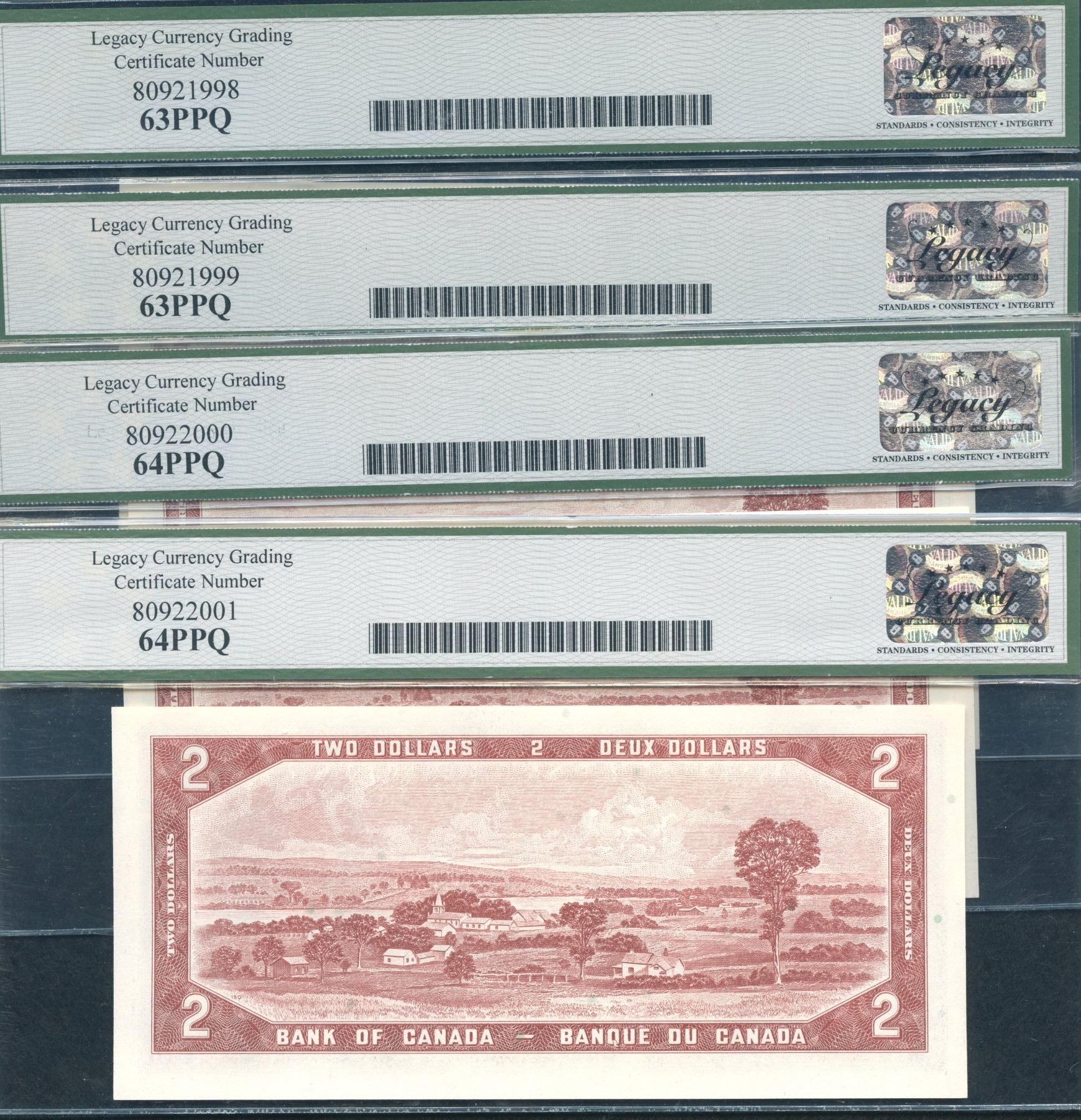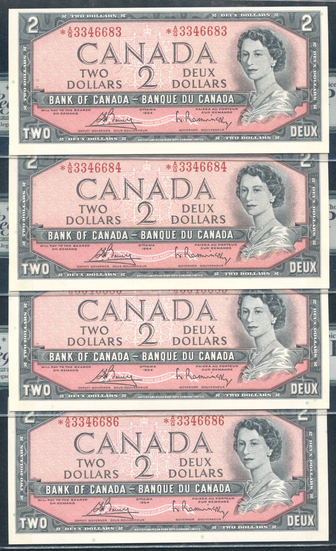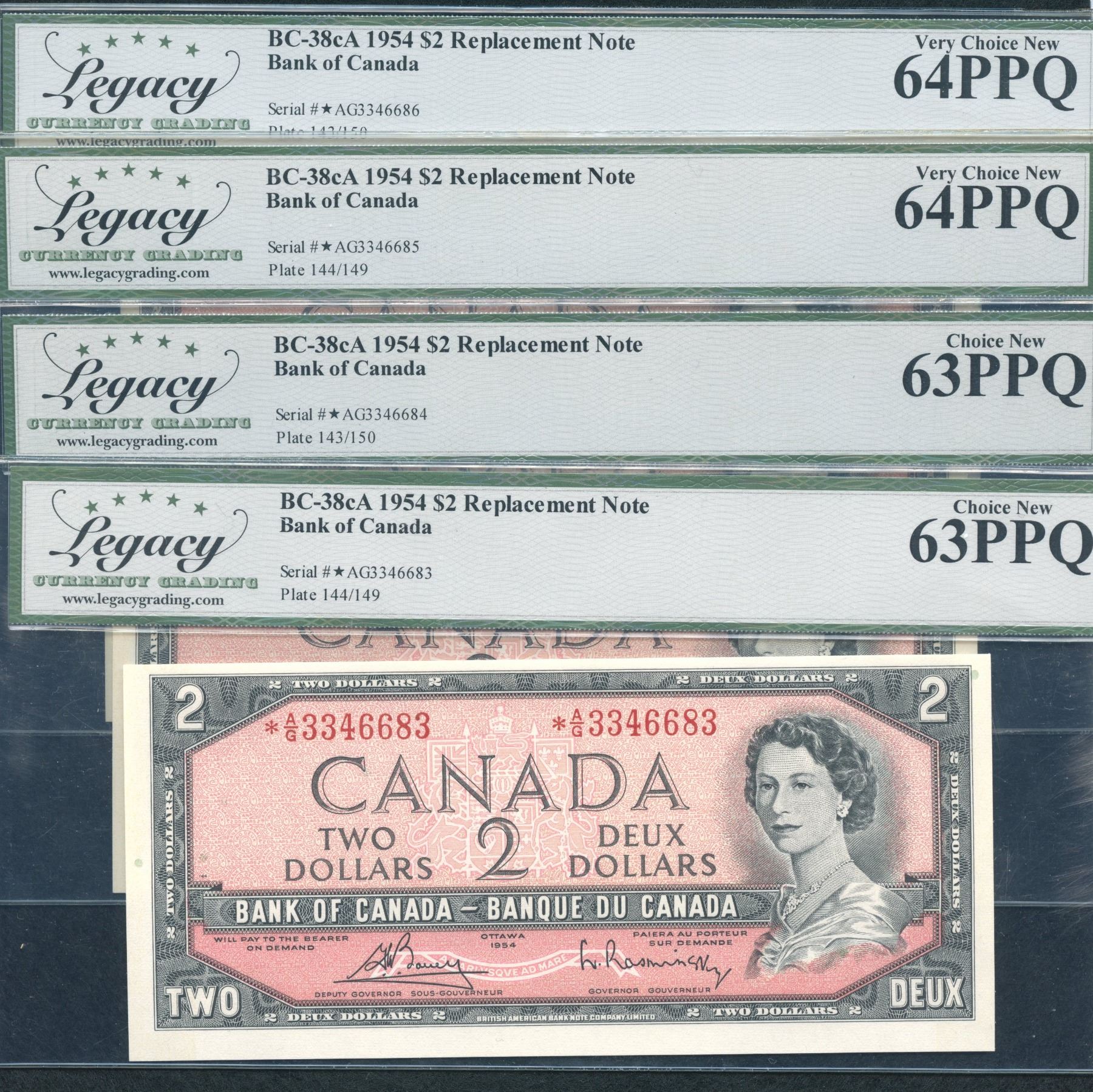 BC-38cA. Legacy Gem New 64 & 63 PPQ. Bouey-Rasminsky. *A/G above 3200000 prefix. A nice 4 consecutive lot of uncirculated replacement notes. *A/G3346683-6686. 4 pcs.