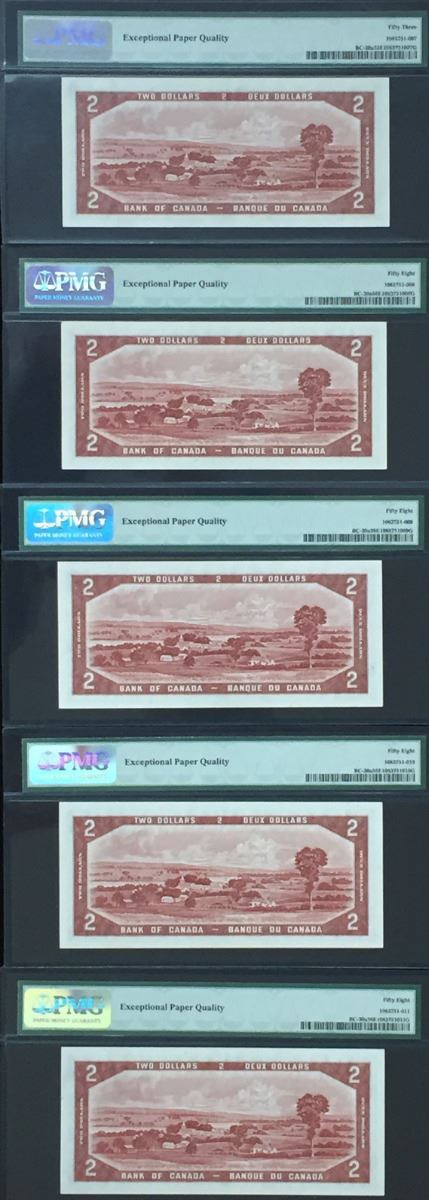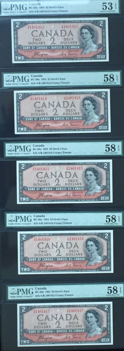 Bank of Canada $2, 1954 Devil's Face Lot of 5