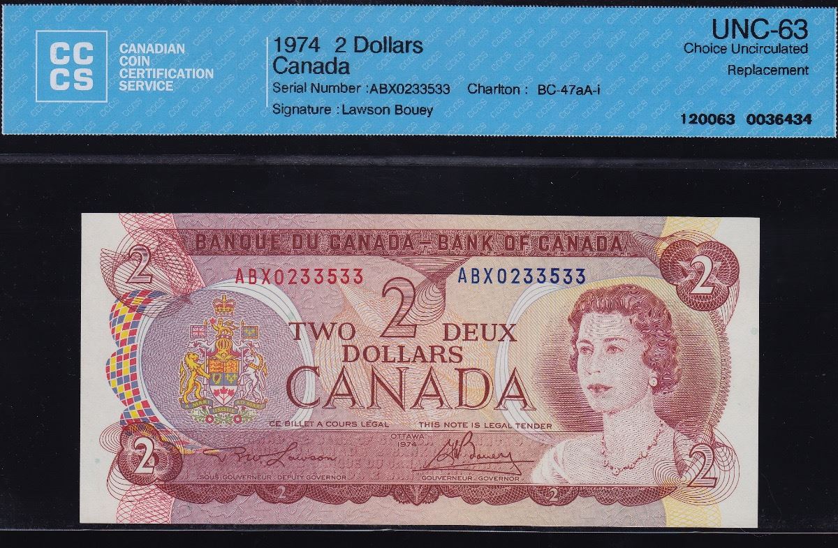 Bank of Canada $2, 1974 - Replacement Note - BC-47aA-i, CCCS Choice Uncirculated 63. S/N: ABX0233533.