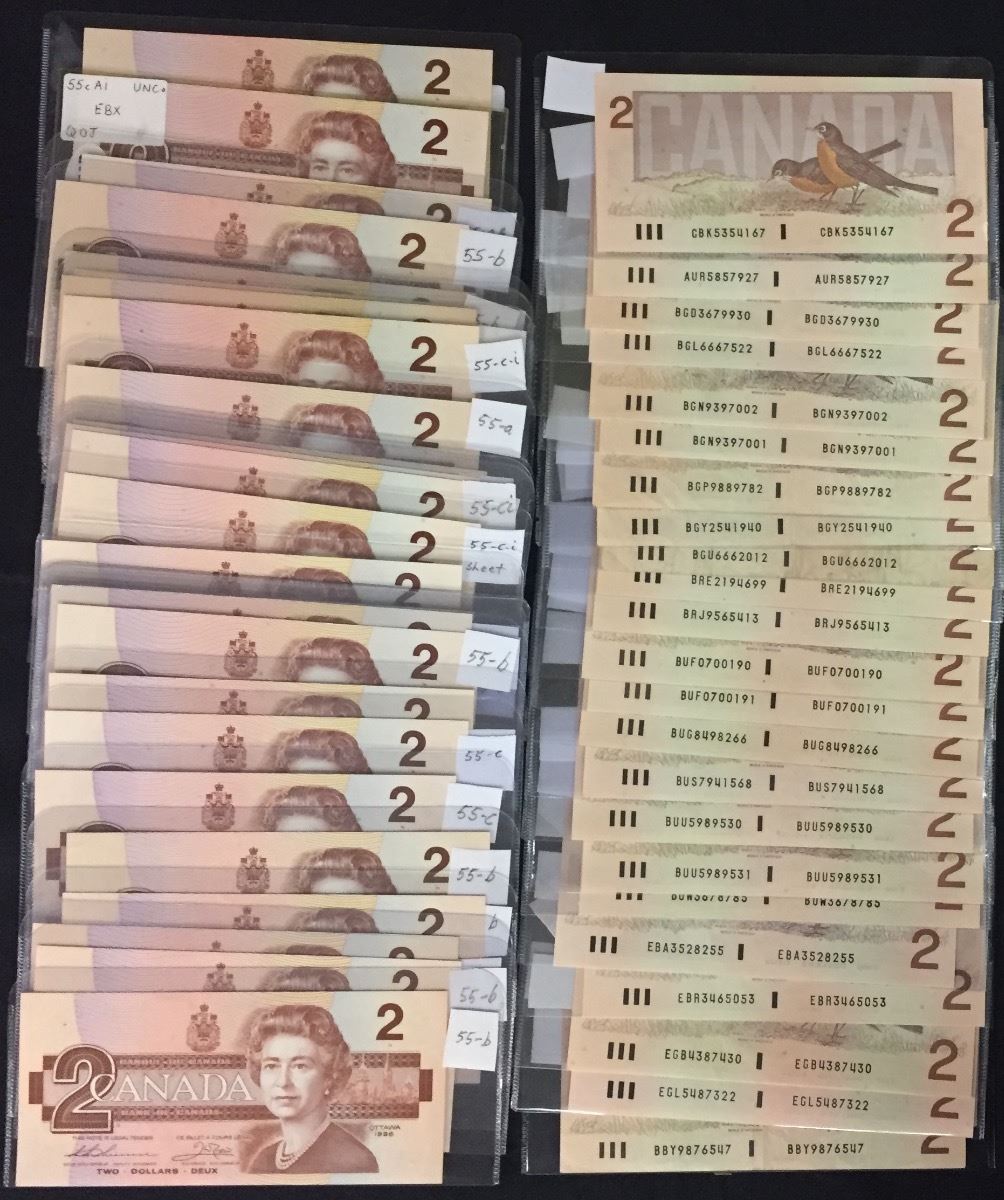 Bank of Canada $2, 1986 - Lot of 51 Including Replacement Notes - Nice disverse selection, mostly uncirculated. Great for a prefix collector. Includes: BC-55-bA, uncirculated, S/N: ARX1675911. 55cAi, uncirculated, S/N: EBX3882696. BC-55-aA, uncirculated, S/N: BBX3488850. 51 Pcs.