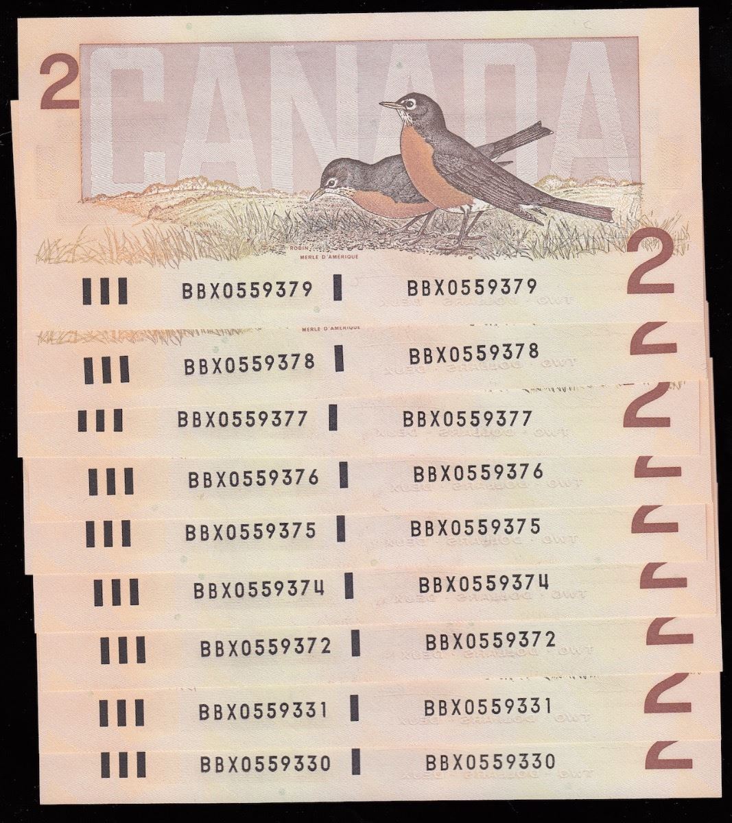 Bank of Canada $2, 1986 - Lot of Ten Replacement Notes - BC-55bA, large B. Choice Unc's. S/N: BBX0559372 - BBX0559379 and BBX0559330-BBX0559331. Cat. value $160.
