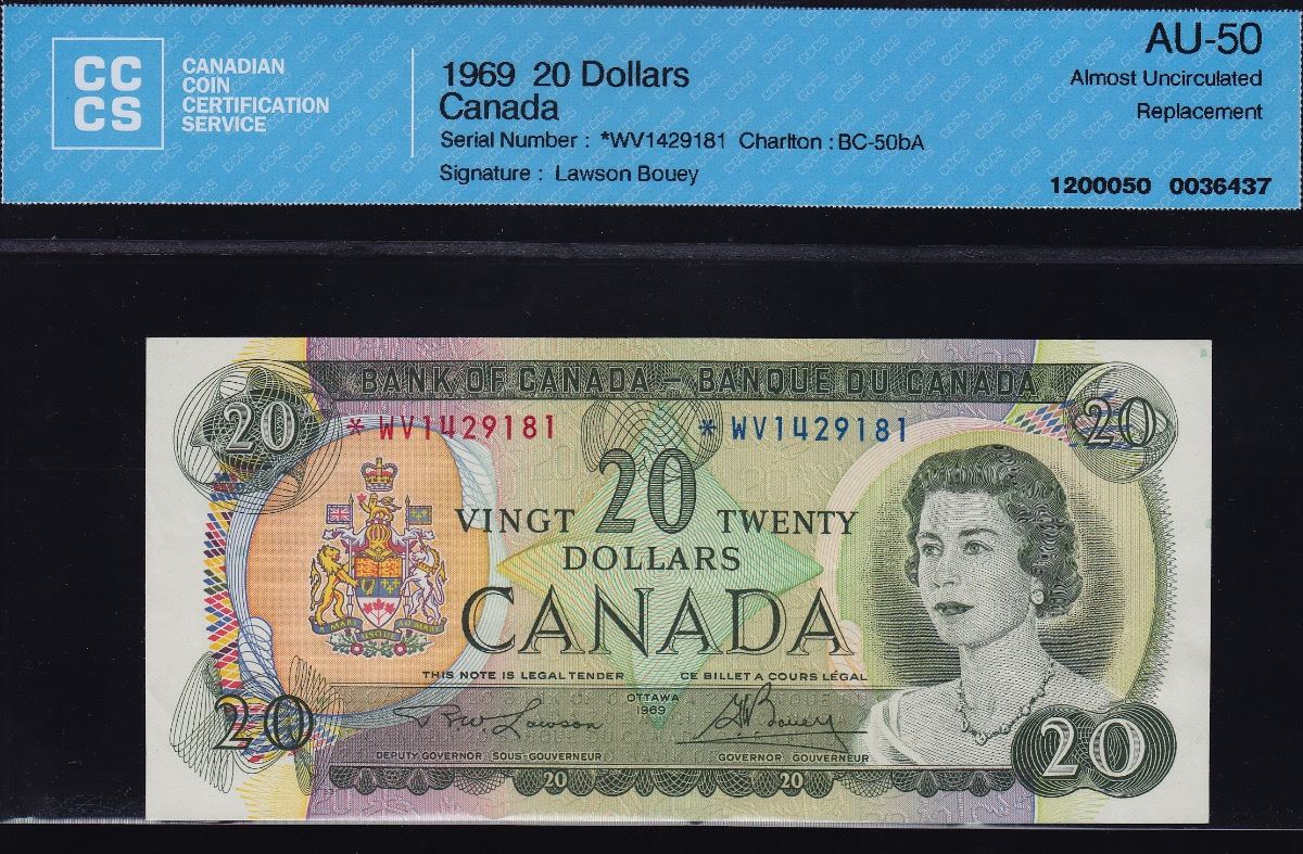 Bank of Canada $20, 1969 - Replacement Note - BC-50bA. CCCS AU-50. S/N: *WV1429181.