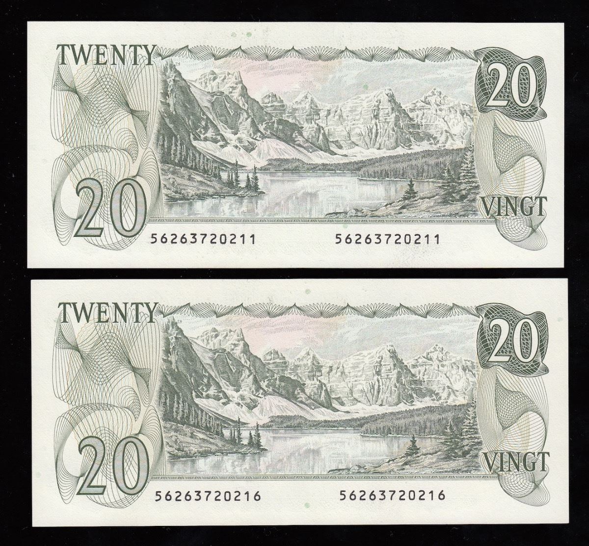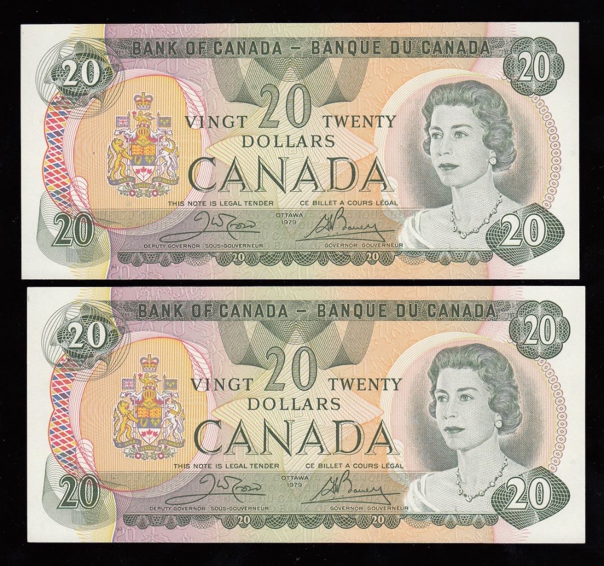 Bank of Canada $20, 1979 - Lot of Two Notes - Includes: 2 x BC-54b-i. Both Unc's with full embossing. 2 Pcs.