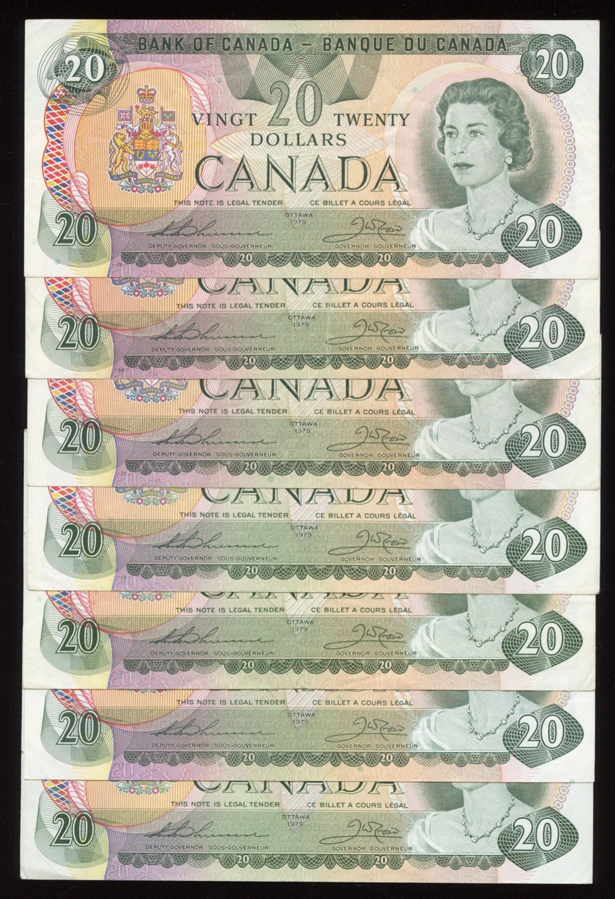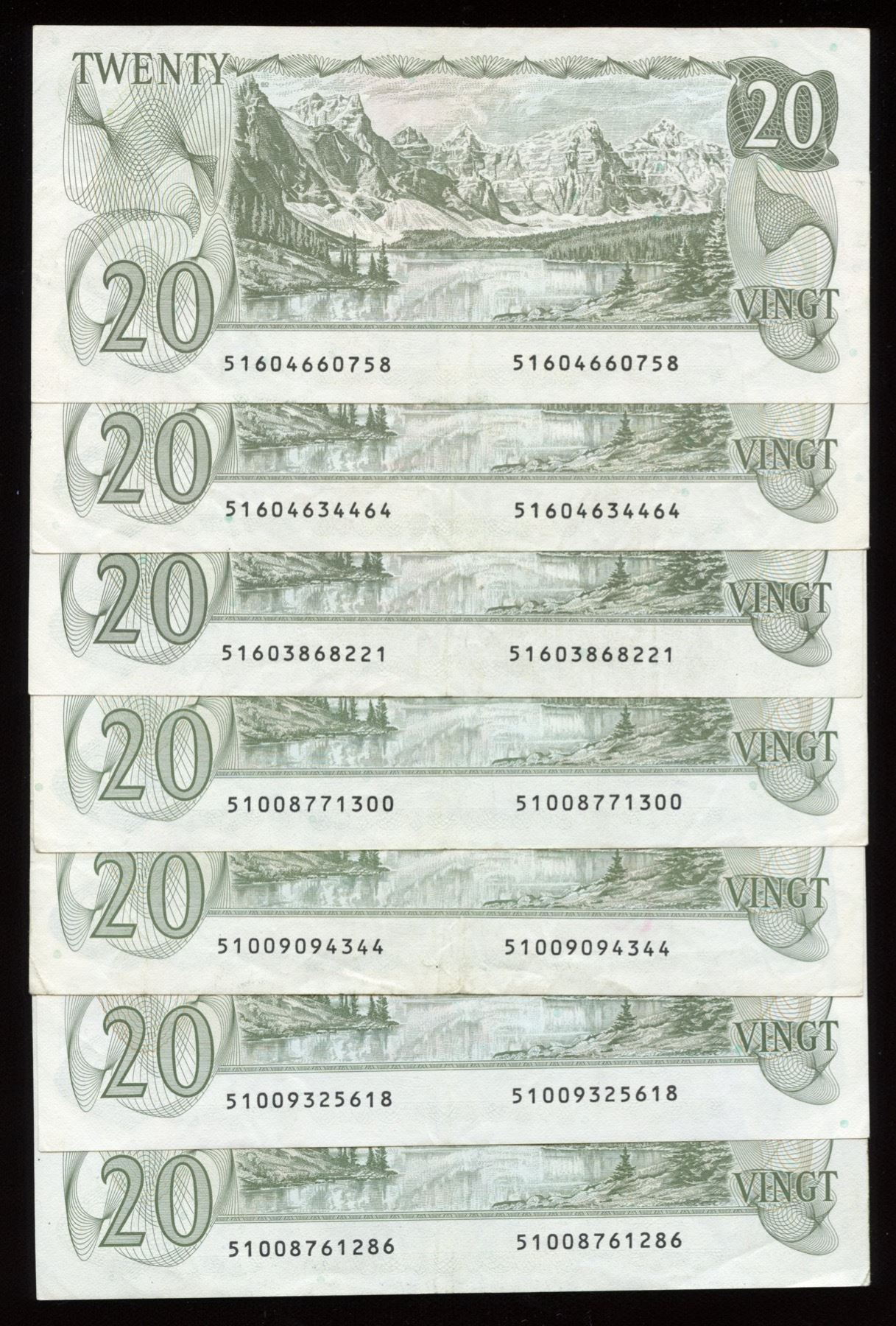 Thiessen-Crow 1979 Bank of Canada collection of the popular "Moraine Lake" back design notes. 51008771300, 51009094344, 51009325618, 51008761286, 51604660758, 51604634464, 51603868221. Various conditions, viewing is recommended. 7 Pcs.
