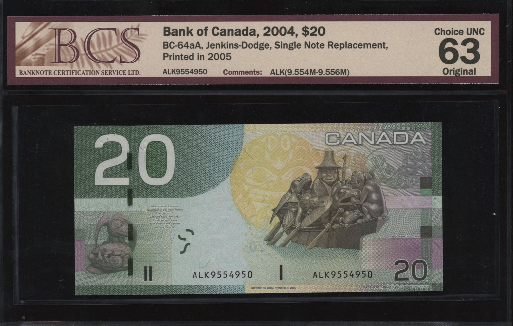 BC-64aA, Jenkins-Dodge, Single Note Replacement. Printed in 2005. BCS Choice UNC 63 Original. S/N:ALK9554950, ALK(9.554M-9.556M).