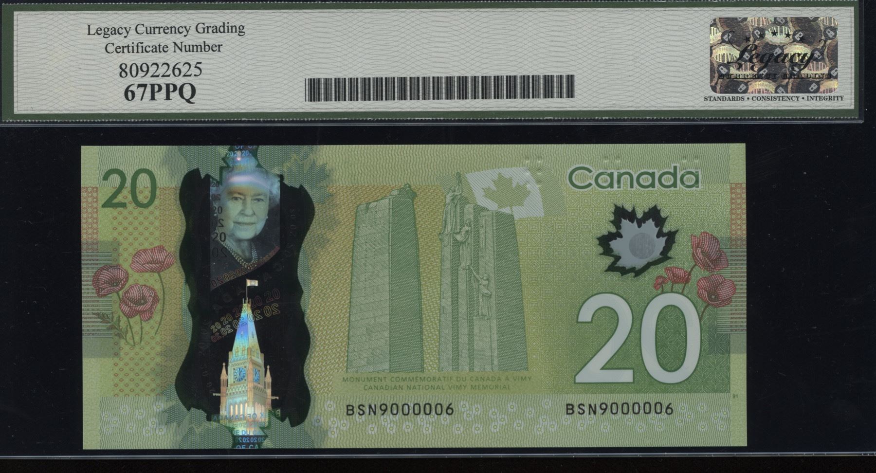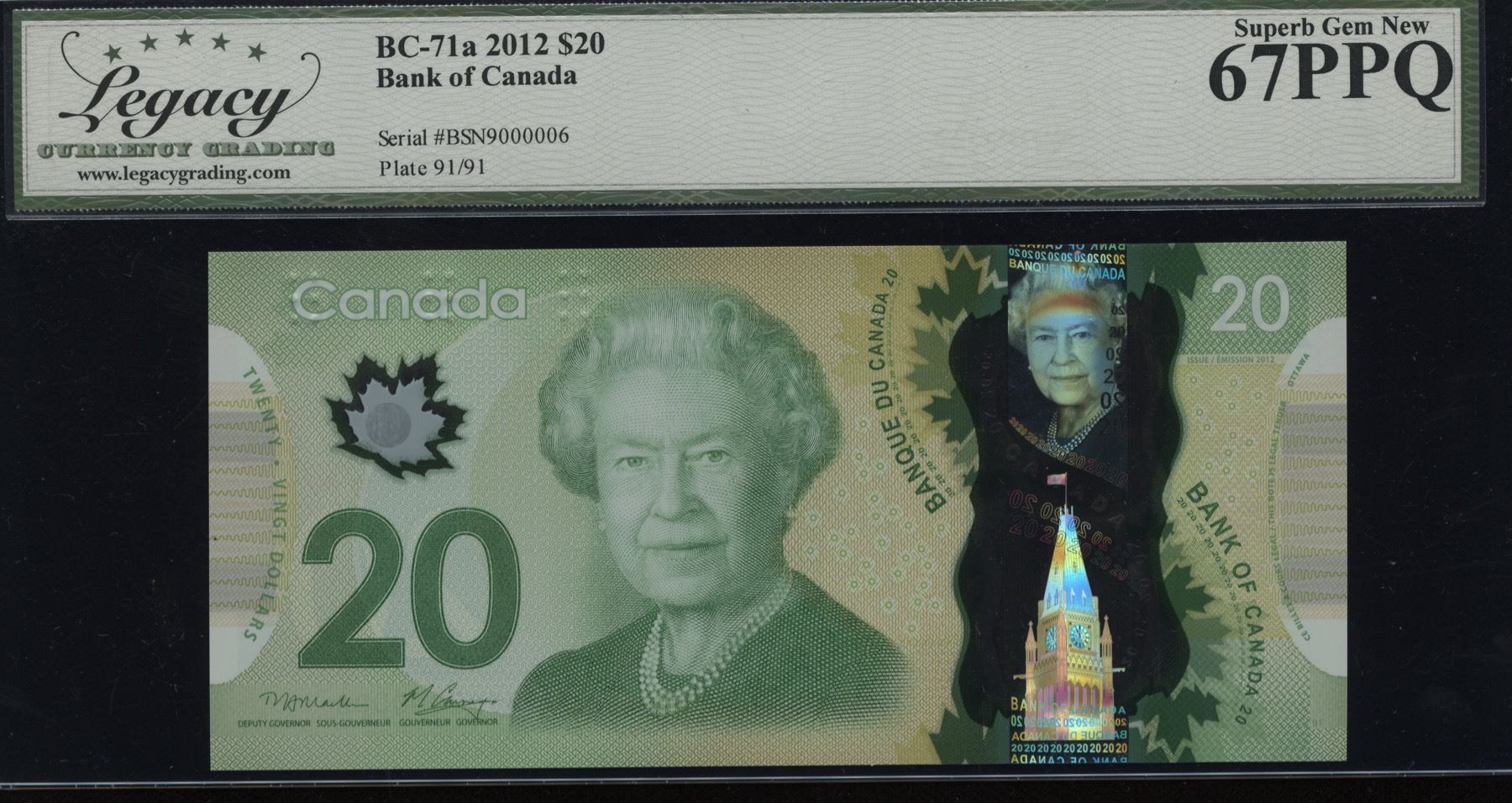 BC-71a. N9. Legacy Superb Gem New 67 PPQ. Macklem-Carney, true "ROTATOR" or "SWIMS" note. The serial number remains the same when the note is rotated through a half turn (upside-down). A very difficult note to find in top grade for your collection. S/N: BSY9000006.