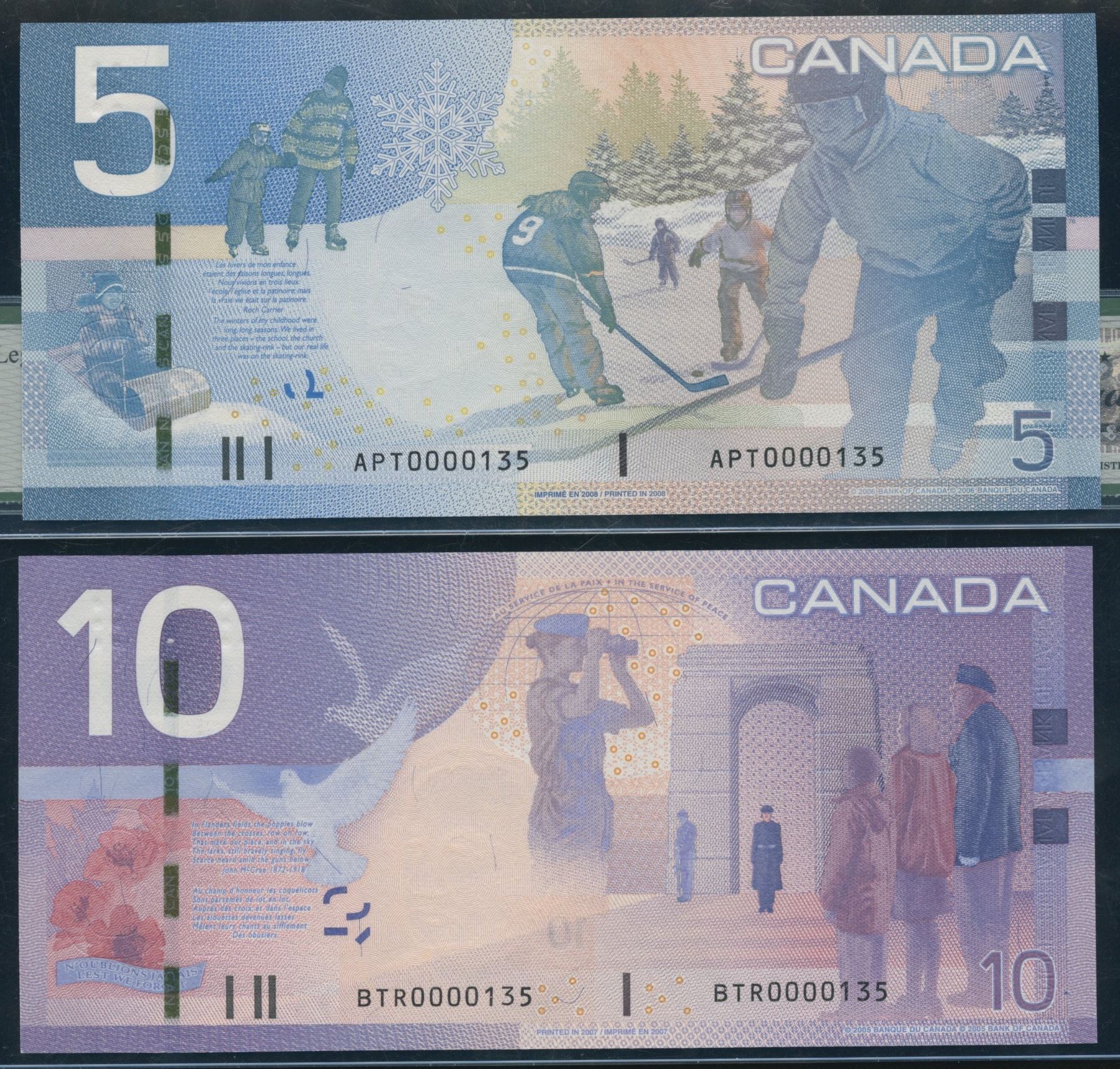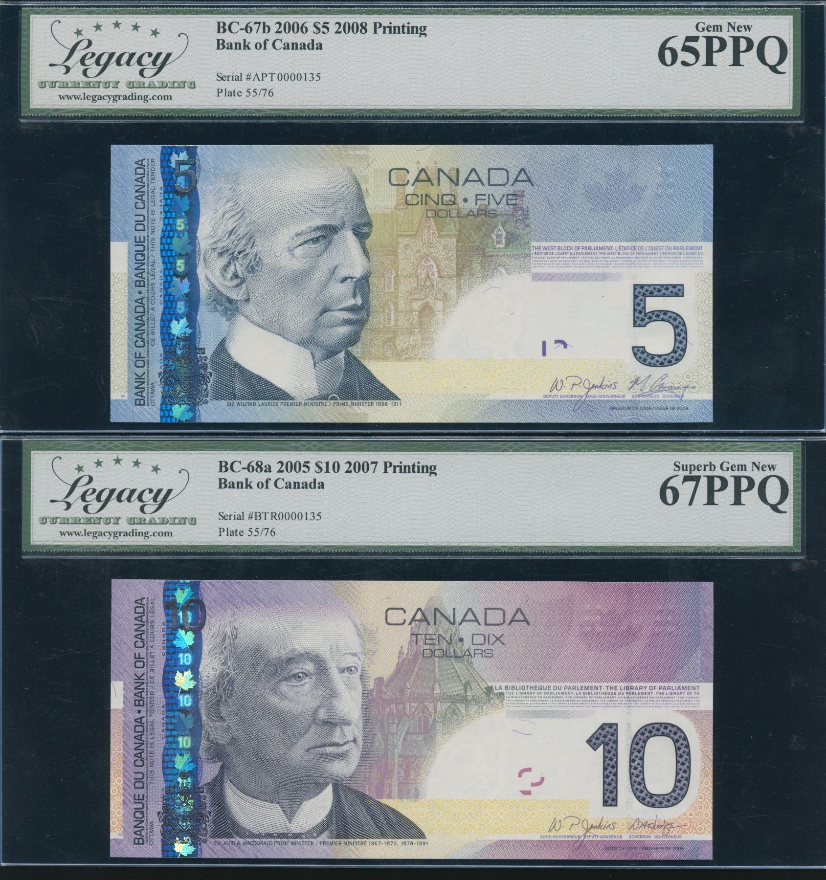 BC-67b-N5-iv. Legacy Gem New 65PPQ, Prefix "APT"; BC-68a. Legacy Superb Gem New 67PPQ, Prefix "BTR". Matching Low Serial Number. S/N:0000135. A match to the two previous lots. 2 Pcs.