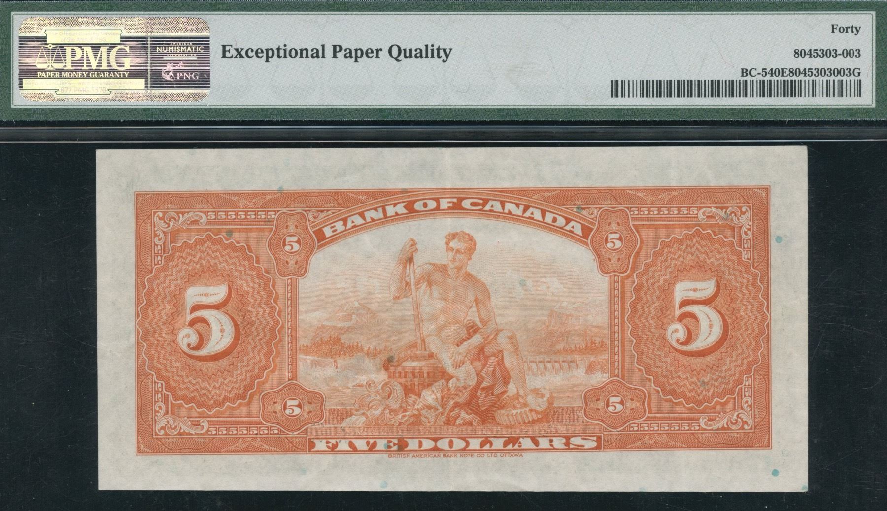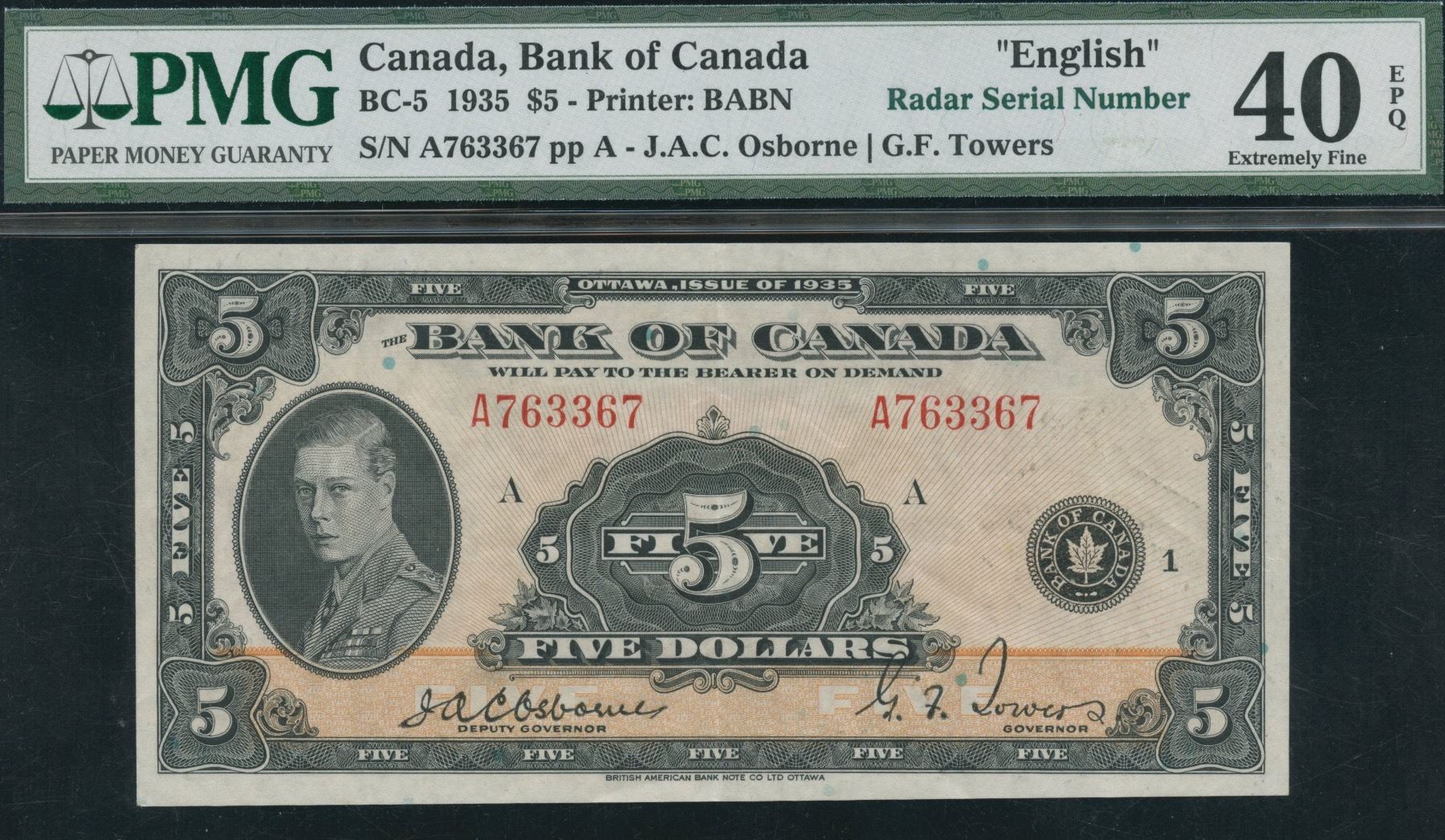 BC-5. PMG Extremely Fine 40 EPQ. S/N: A763367/A. Part of the Botany Collection.