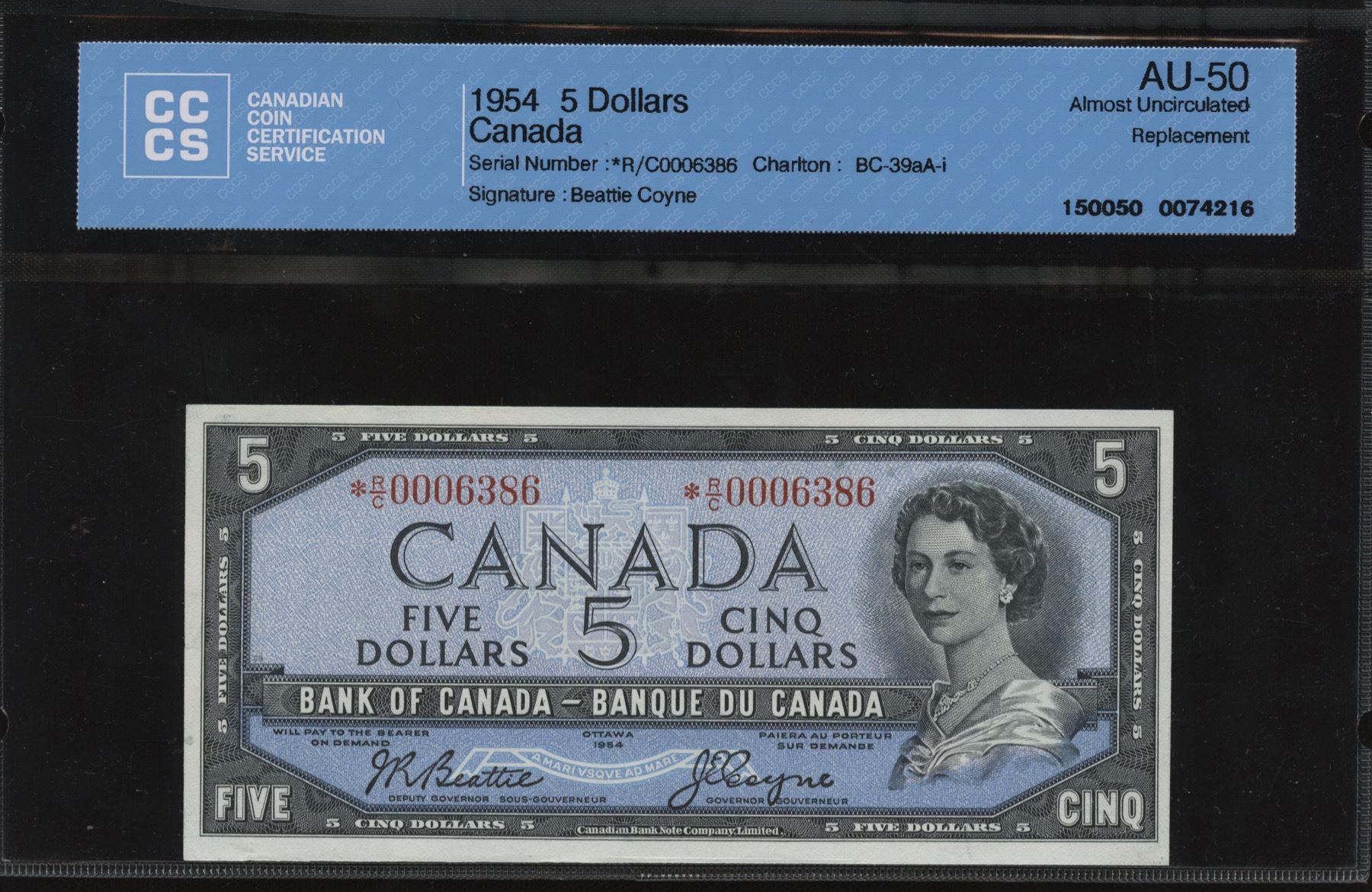 BC-39aA. CCCS AU-50. With only 8000 notes printed with the Beattie-Coyne signatures, this is a must have for the collector. S/N:*R/C0006386.