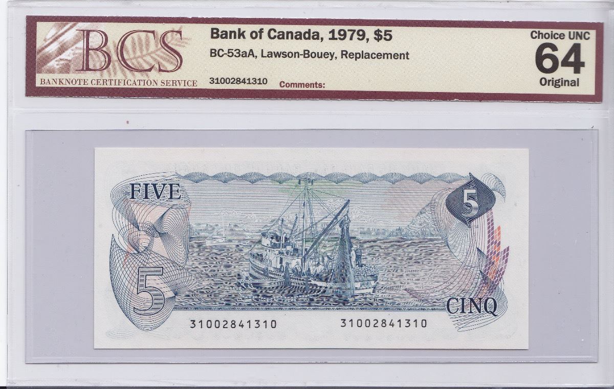 Bank of Canada $5, 1979 Replacement Note - BC53aA - Lawson-Bouey; BCS Choice UNC 64 Original, S/N:31002841310.