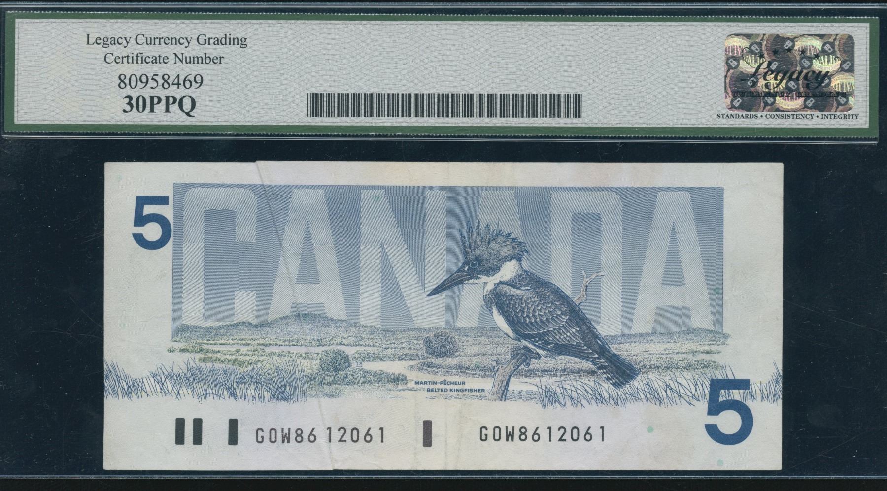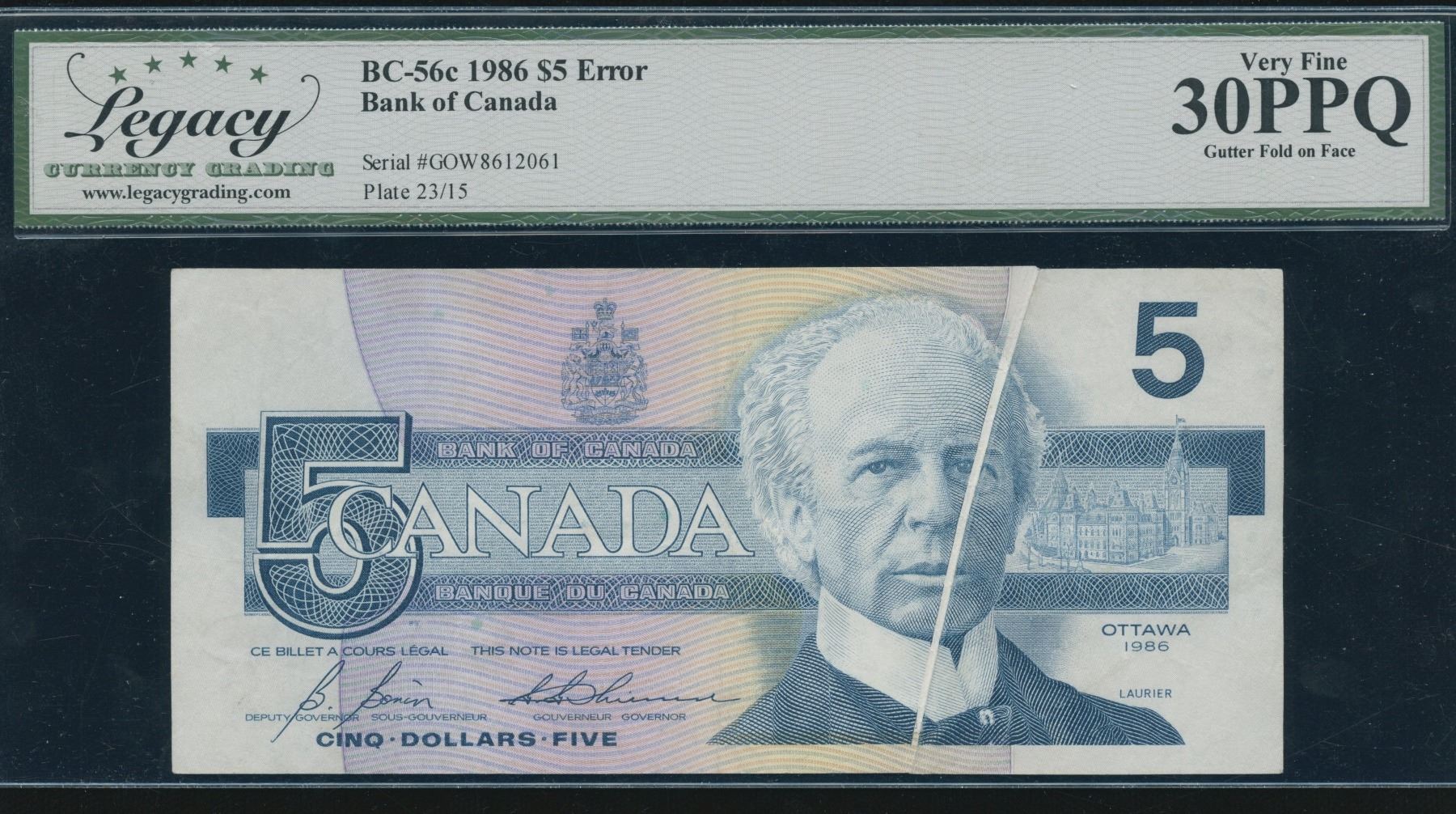 BC-56c-i-E23i. Legacy Very Fine 30 PPQ. Bonin-Thiessen. Error - Pre-Print Crease. A streak on the face of the note caused by a fold during the print process. Also known as a cutter fold. S/N: GOW8612061