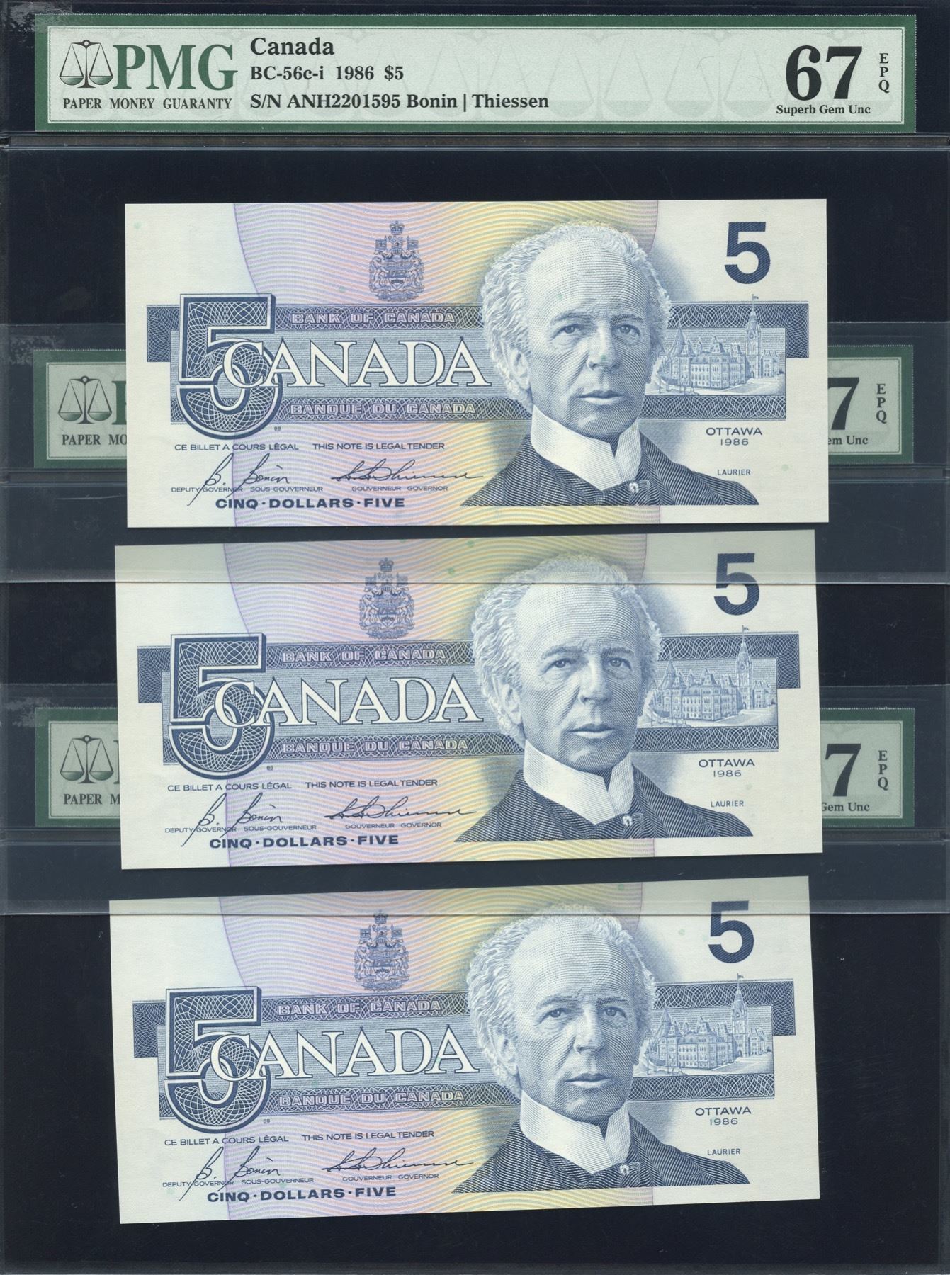 Bank of Canada $5, 1986 - Lot of 3 Consecutives Transitional Prefix's