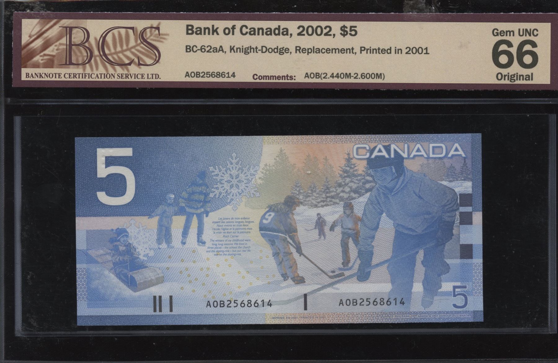 BC-62aA. BCS Gem UNC 66 Original. S/N:AOB2568614.