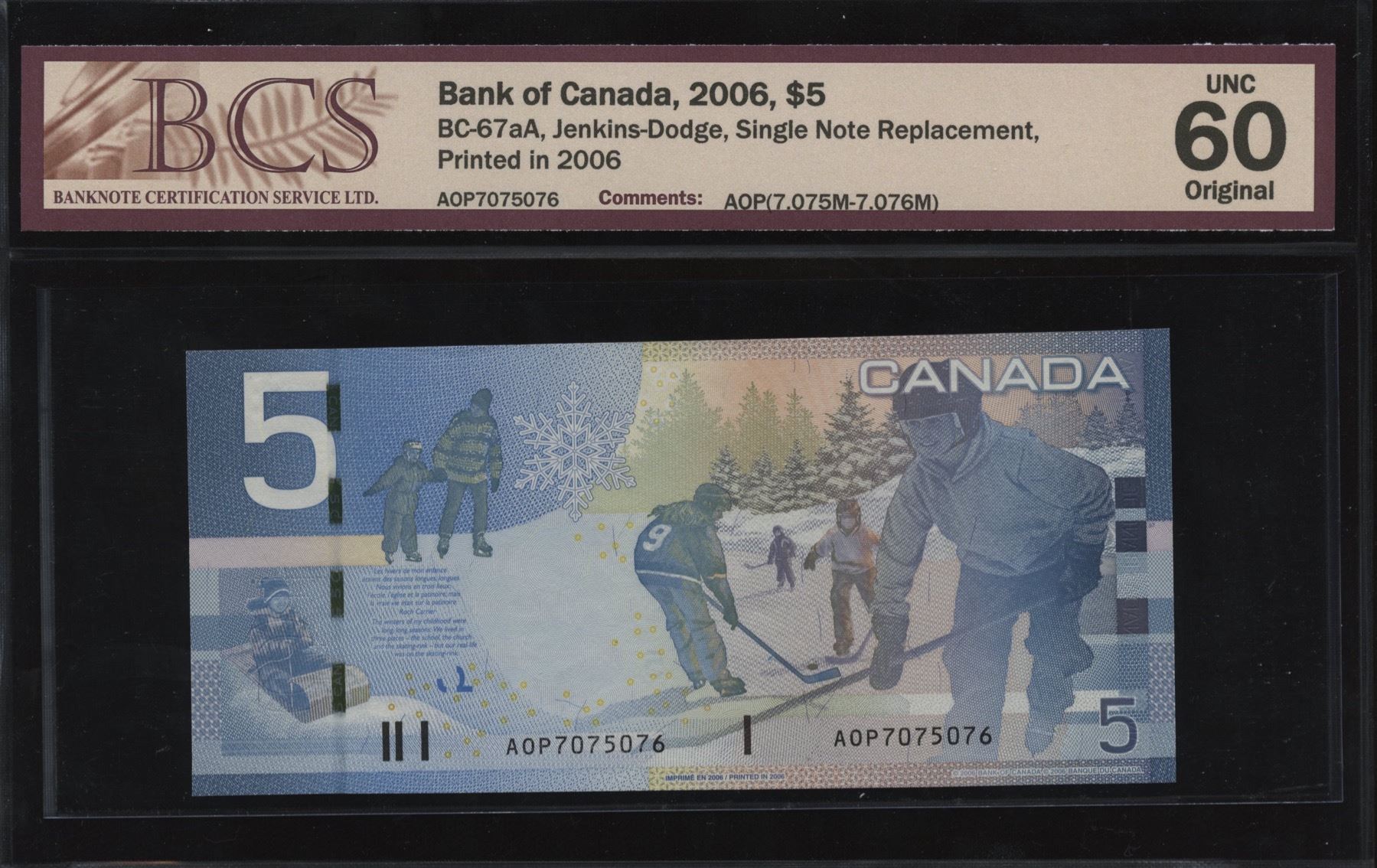 BC-67aA, Jenkins-Dodge, Single Note Replacement, Printed in 2006. BCS UNC 60 Original. S/N:AOP7075076, AOP(7.075M-7.076M).
