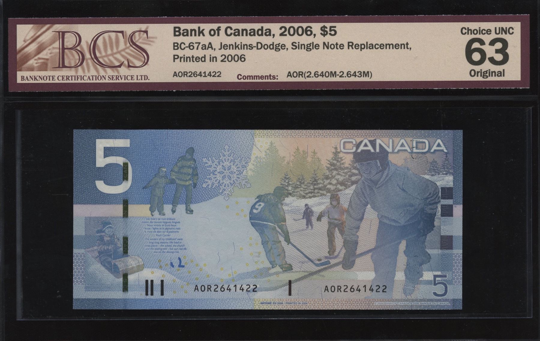 BC-67aA, Jenkins-Dodge, Single Note Replacement, Printed in 2006. BCS Choice UNC 63 Original. S/N:AOR2641422, AOR(2.640M-2.643M).