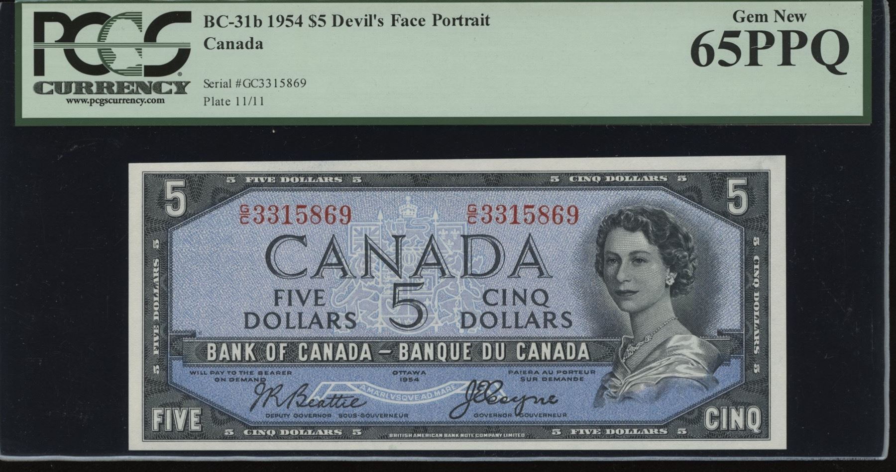 1954 Bank of Canada $5 Devil's Face, BC-31b, Beattie-Coyne, PCGS Gem New 65 PPQ, S/N G/C 3315869. A high-grade note.