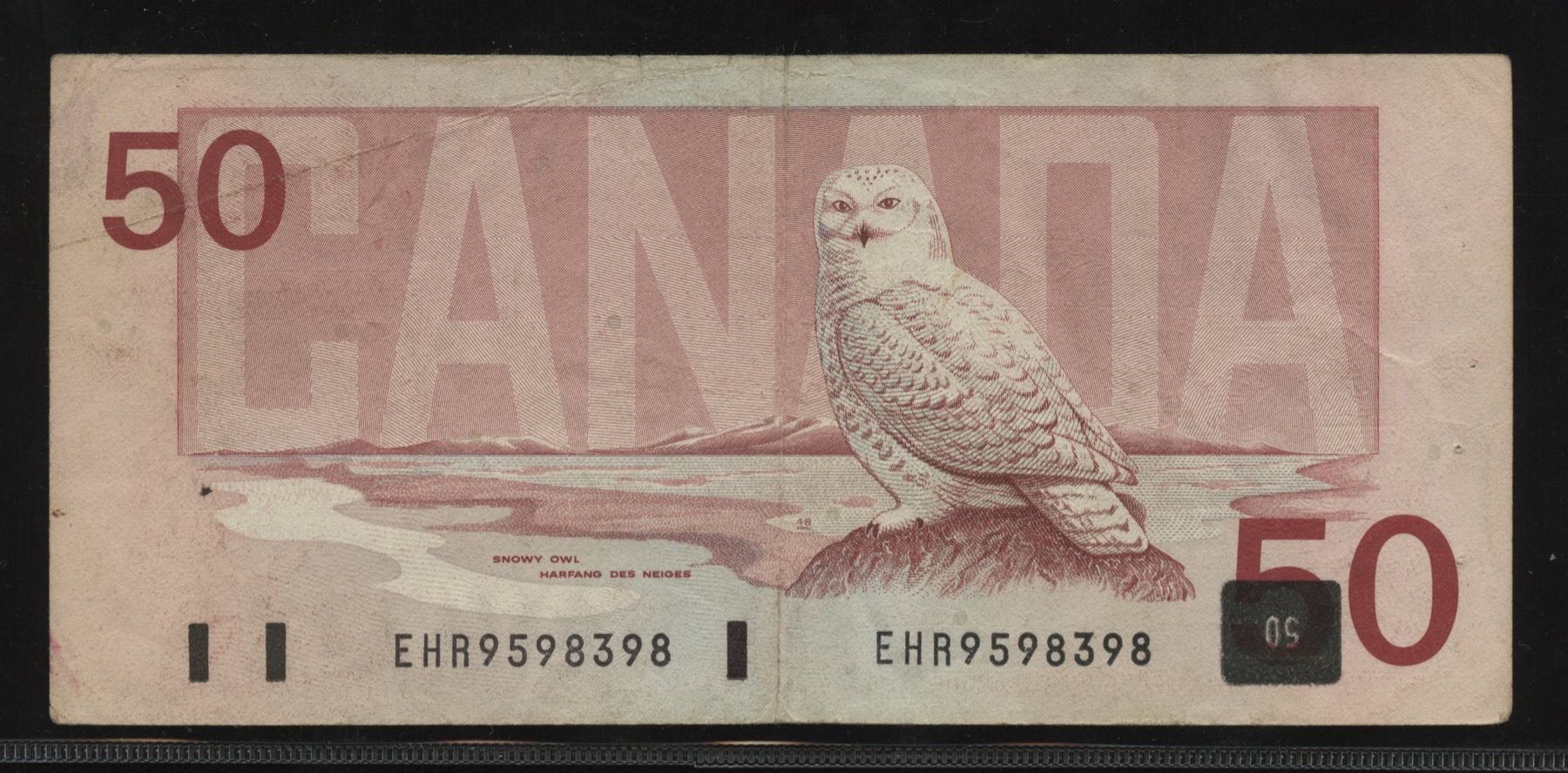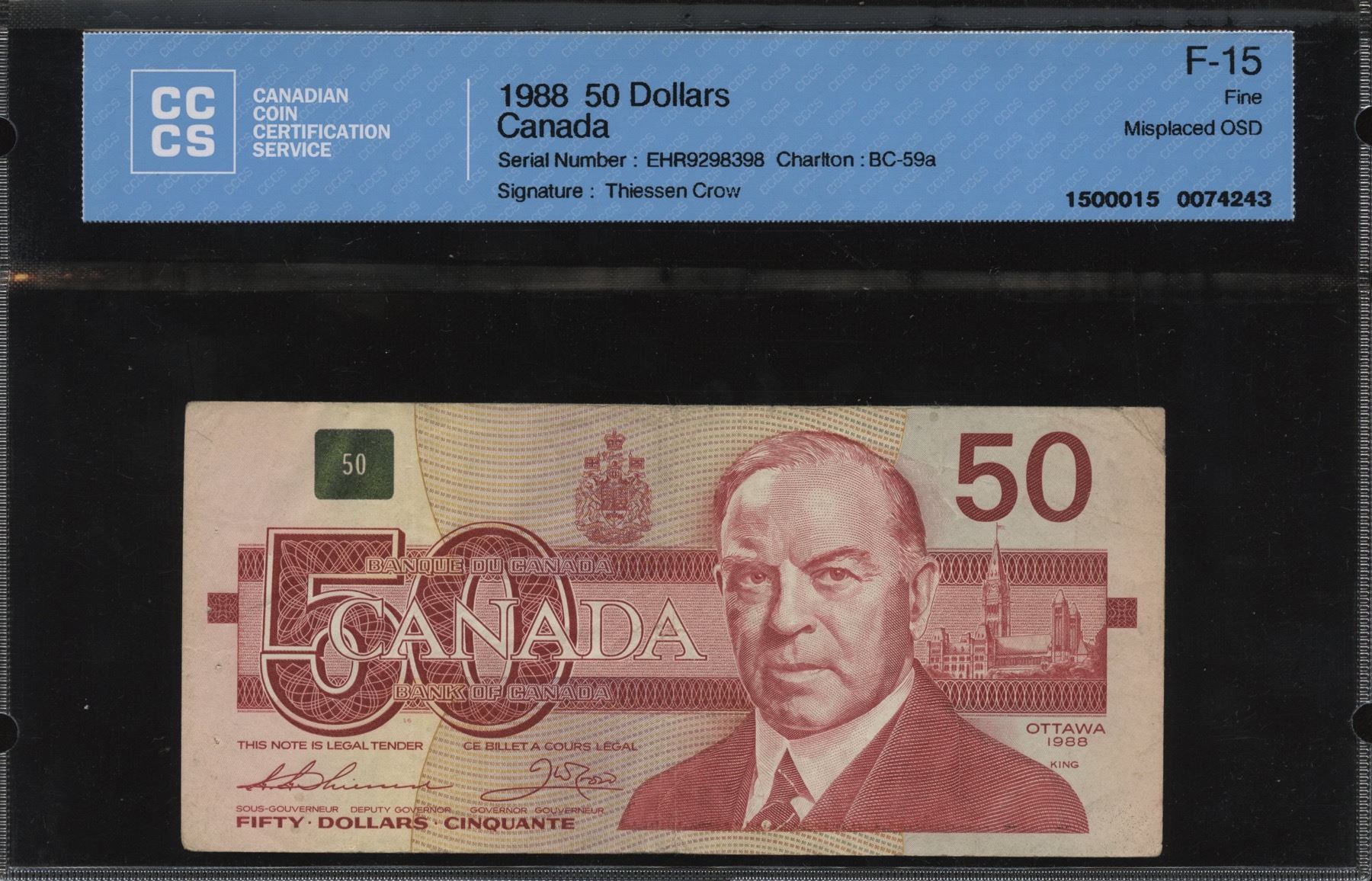 BC-59a. E8. CCCS F-15. Misplaced Optical Security Device. A double OSD note. The front OSD is fully intact and in the correct position, along with a beautiful error of the off-set of a full second Optical Security Device inverted on the back of the note. Two OSD's for the price of one. S/N:EHR9598398.