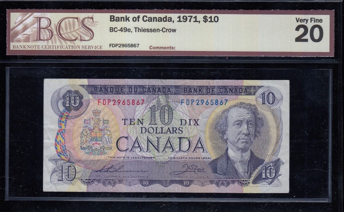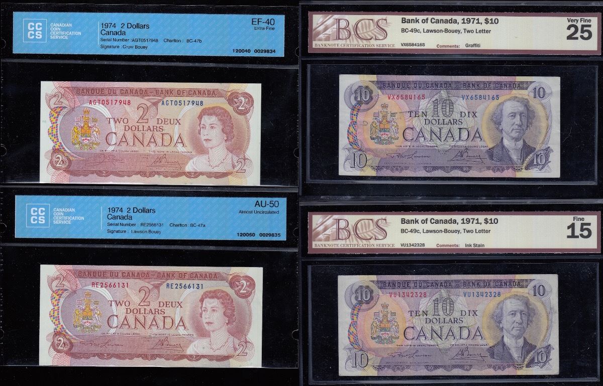 Bank of Canada Certified Banknotes - Lot of Five - BC-47a, CCCS AU-50. BC-47b, CCCS EF-40. BC-49c, BCS F-15, ink stain. BC-49c, BCS VF-25. BC-49e, BCS VF-20. 5 Pcs.
