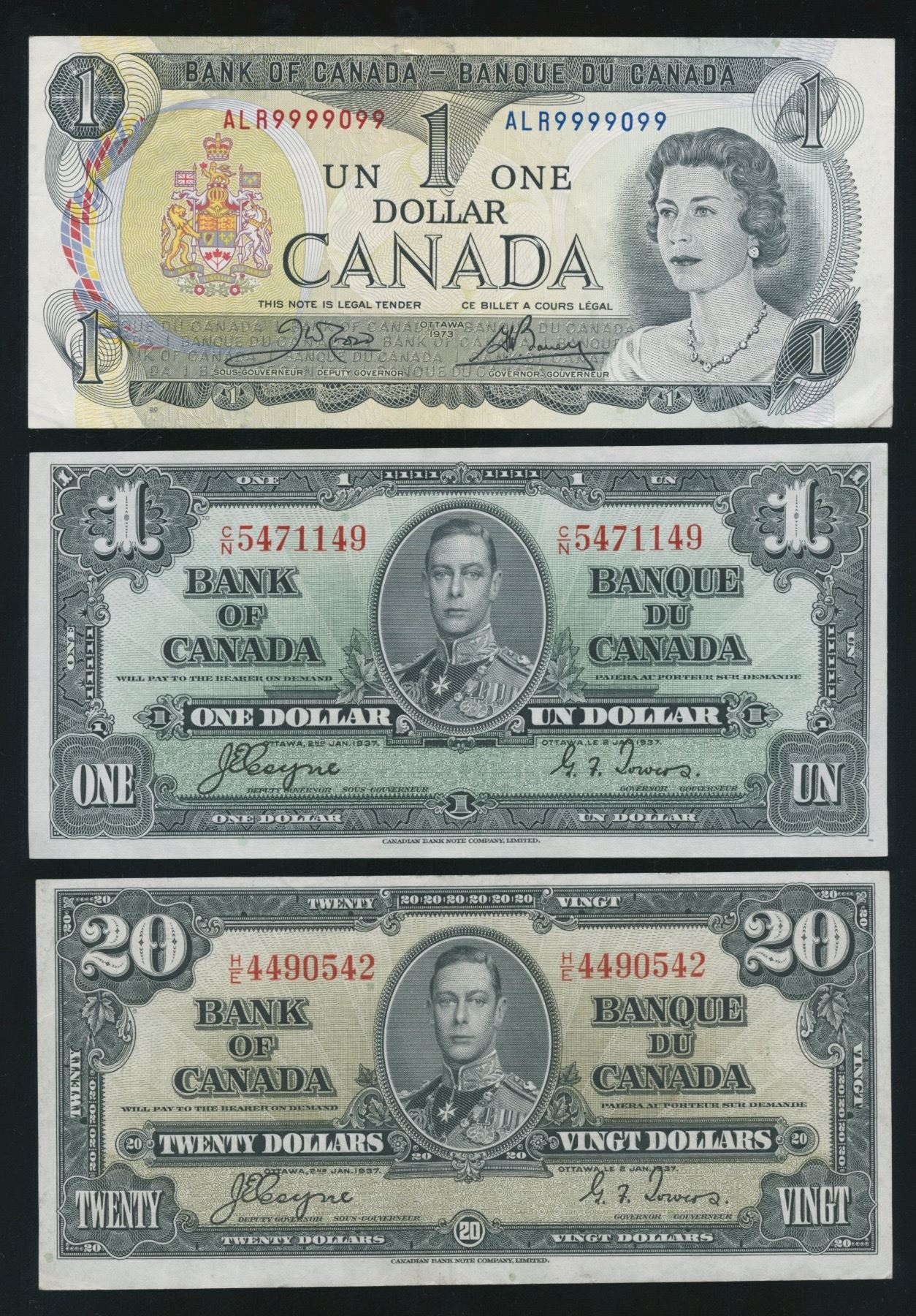 Includes: BC-21d, 1937 $1, AU. BC-25c, 1937 $20, Very Fine. Almost solid digit 1973 $1, VF, S/N: ALR9999099. 3 pcs.