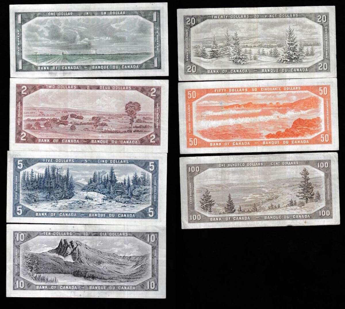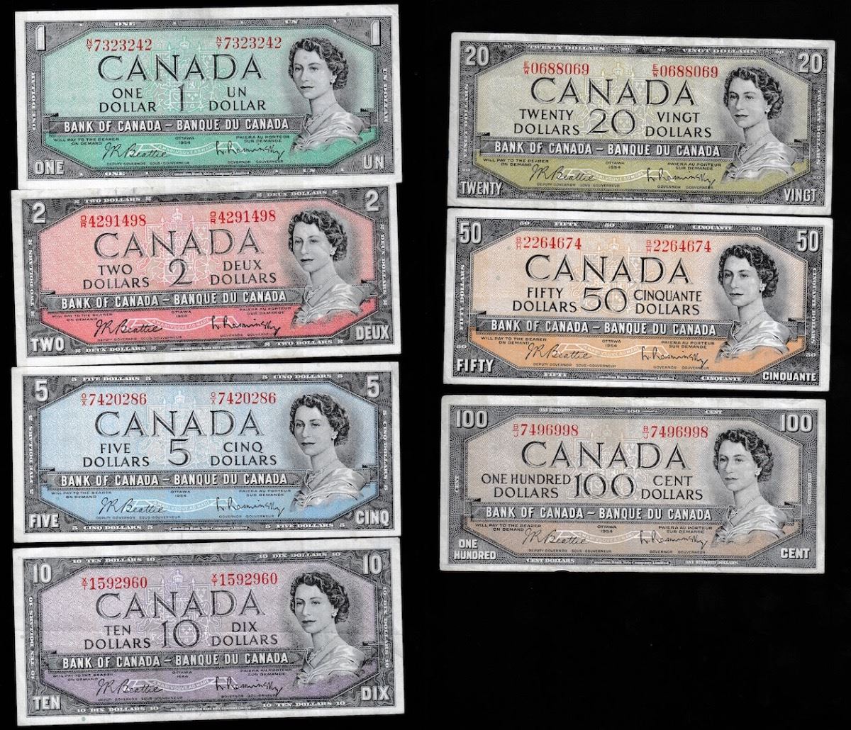 Bank of Canada Matched Signature $1 - $100, 1954 - Set of Banknotes - Modified series, all Beattie - Rasminsky signatures, all VF or better. 7 Pcs.