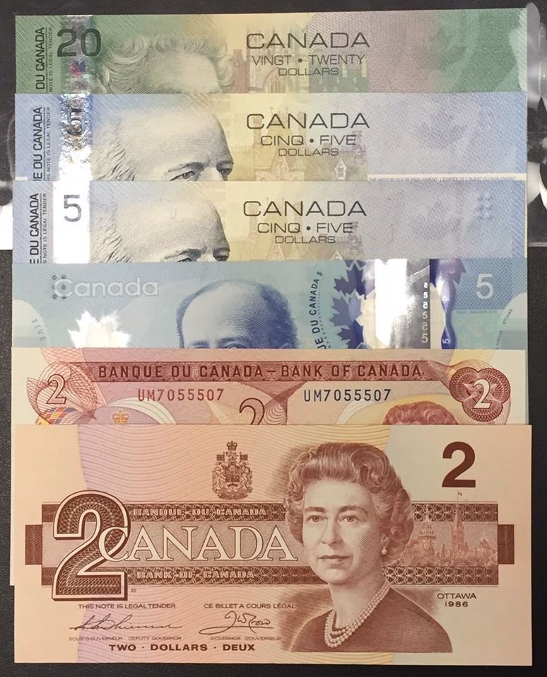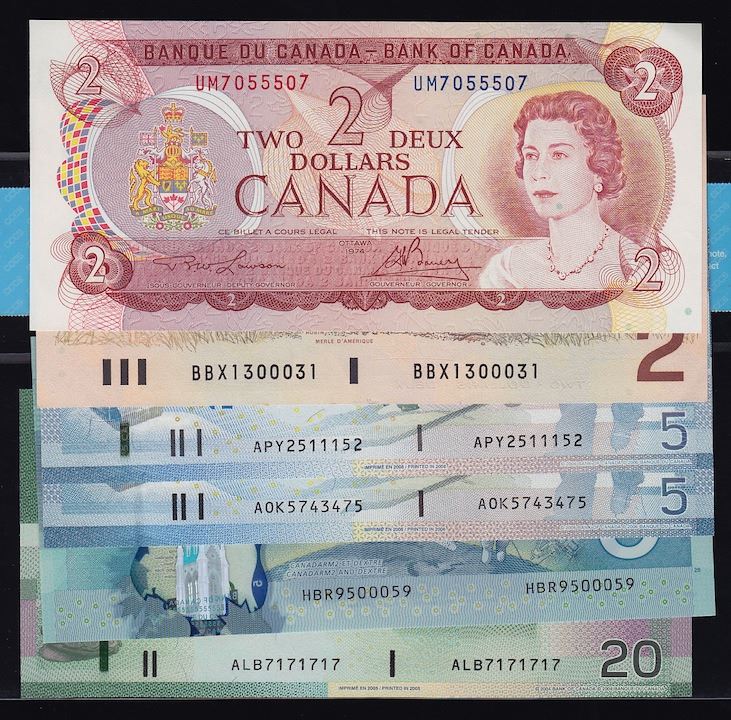 Includes: 1974 $2 CH BC-47a, S/N:UM7055507; 1986 $2 Replacement, CH BC-55bA, S/N:BBX1300031; 2005 $20, CH BC-64a, S/N:ALB7171717; 2006 $5, CH BC-67a, S/N:AOK5743475; 2006 $5, CH BC-67b, S/N:APY2511152; 2013 $5, CH BC-69b, S/N:HBR9500059. All in Uncirculated condition. 6 Pcs.