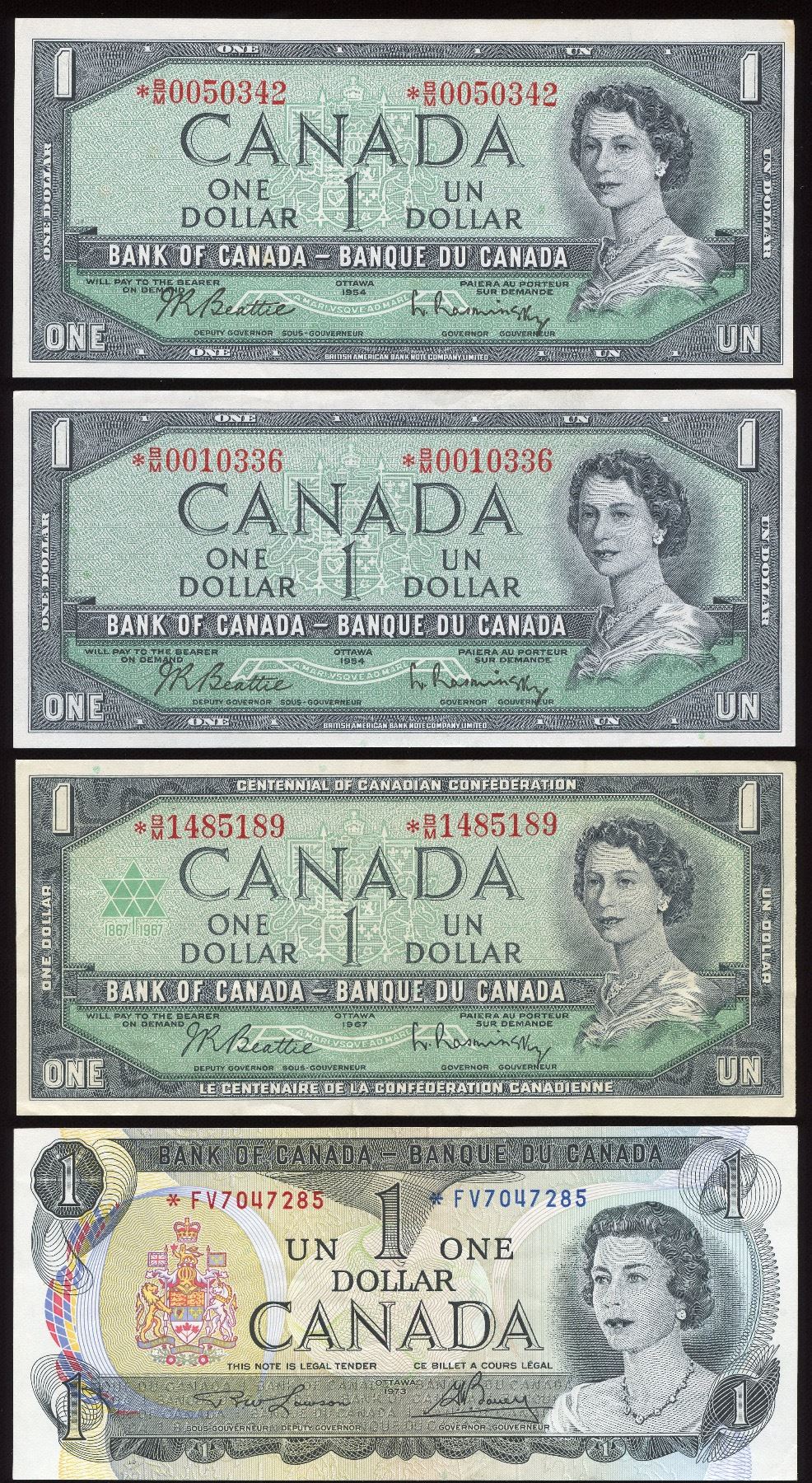 $1 1954, BC-37bA-i, *B/M0050342, Au; *B/M0010336 Unc, $2 1954, BC-36bA, *B/B0090139, EF+; *B/B1538760, VF; *B/B0085091, VF; $1 1964 BC-45bA-i, *B/M1485189, VF+; $1, 1973 *FV7047285, EF/AU. 7 Note Replacements.