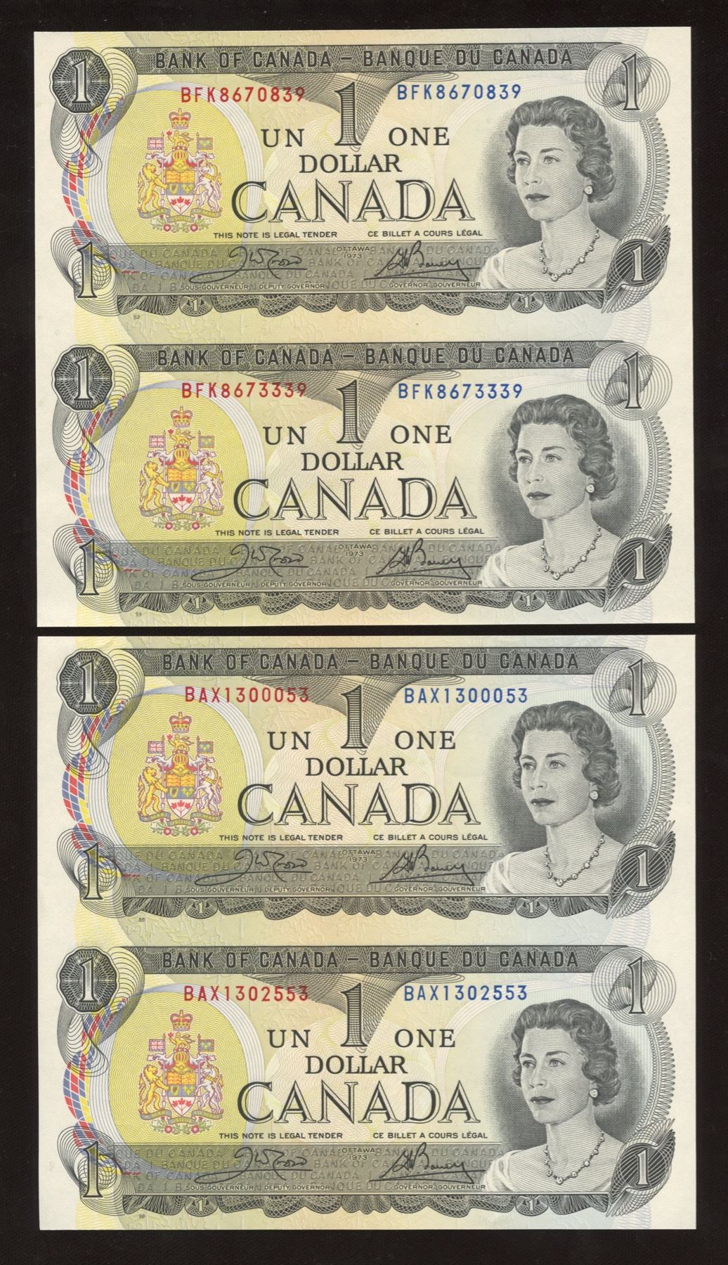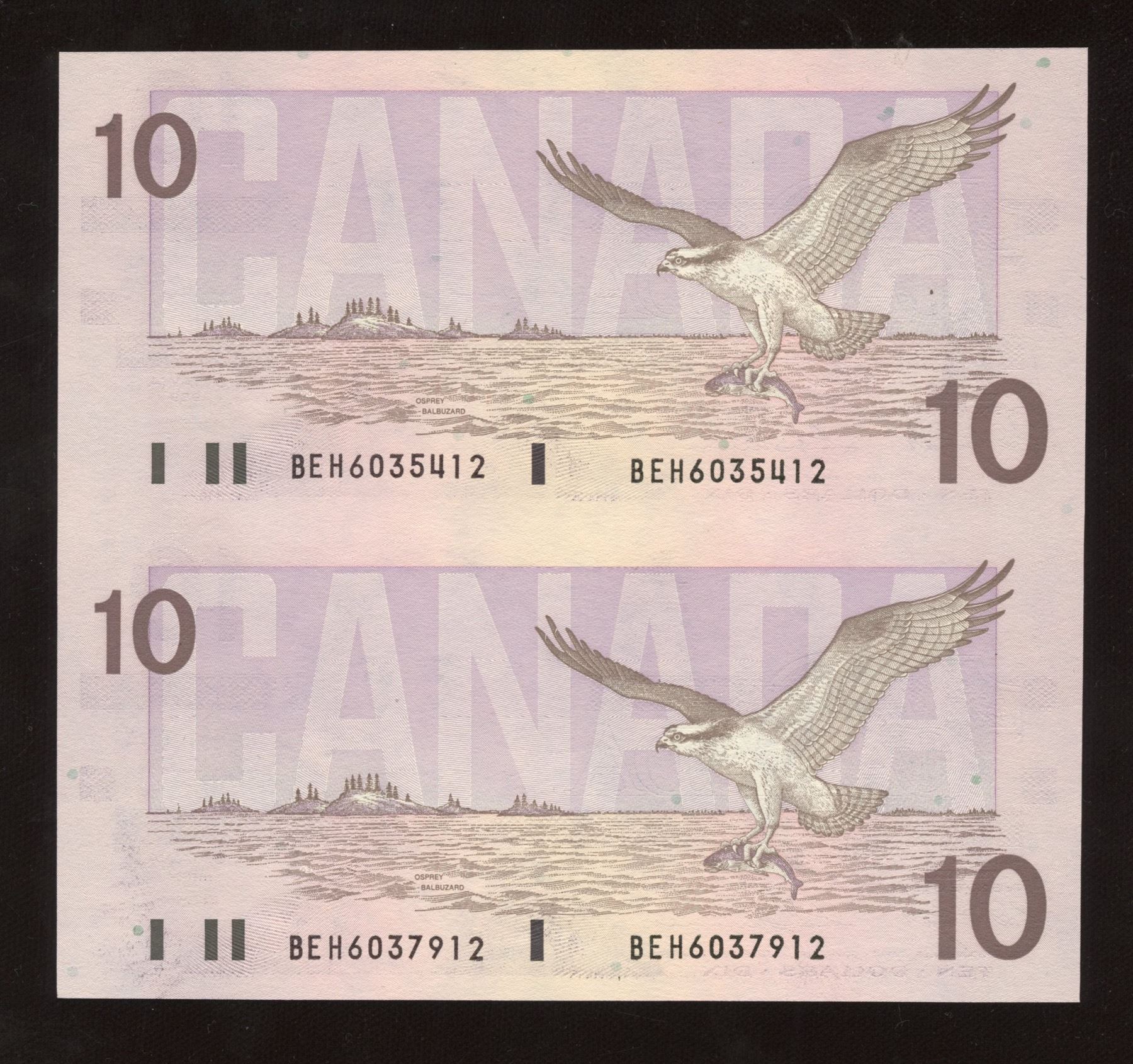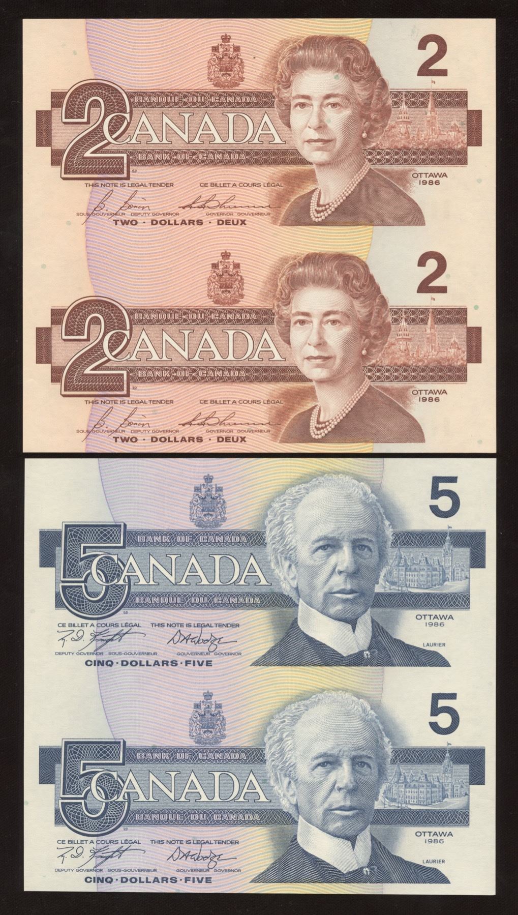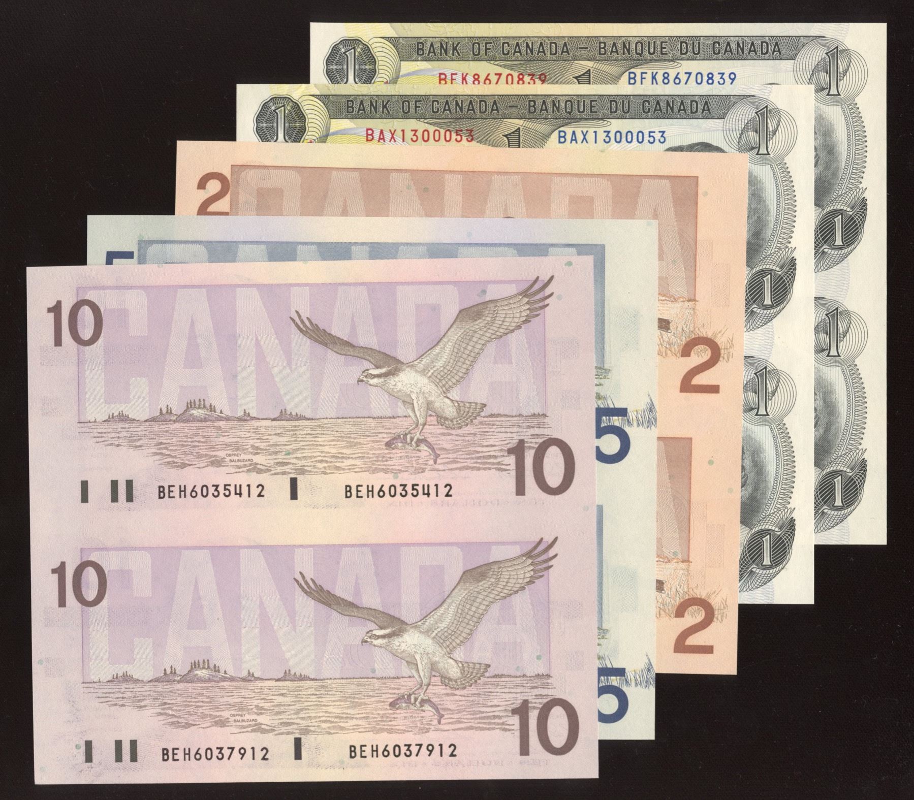 A wonderful collection of uncut banknote pairs, with the difficult to obtain $1 replacement's, $5's & $10's. Included BC-46b 1973 $1; BC-46bA 1973 $1; BC-55c 1986 $2; BC-56e-i 1986 $5; BC-57c 1989 $10. All Unc. Lot of 5 pieces