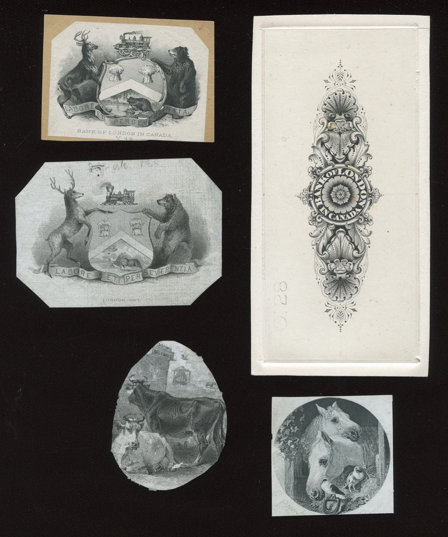 Bank of London in Canada, horse vignette as on $50; cattle on $100; City of London crest on $5, $10 backs; another, larger, apparently engraved for the city, with notation at top; all of the foregoing cut down. Also bank name and fancy design, possibly for use on cheques. Total of five engraved items. Material from this bank is seldom offered.