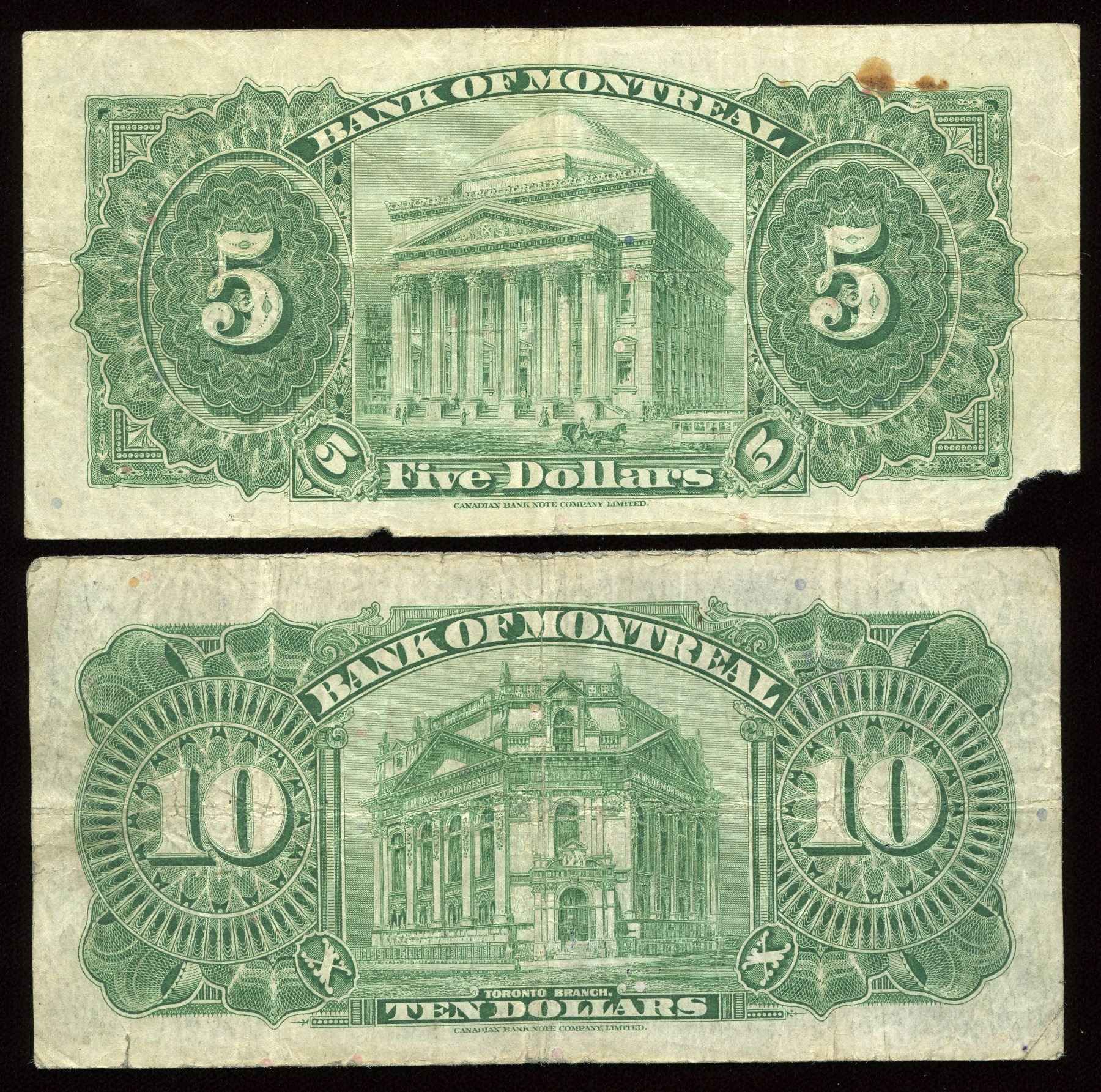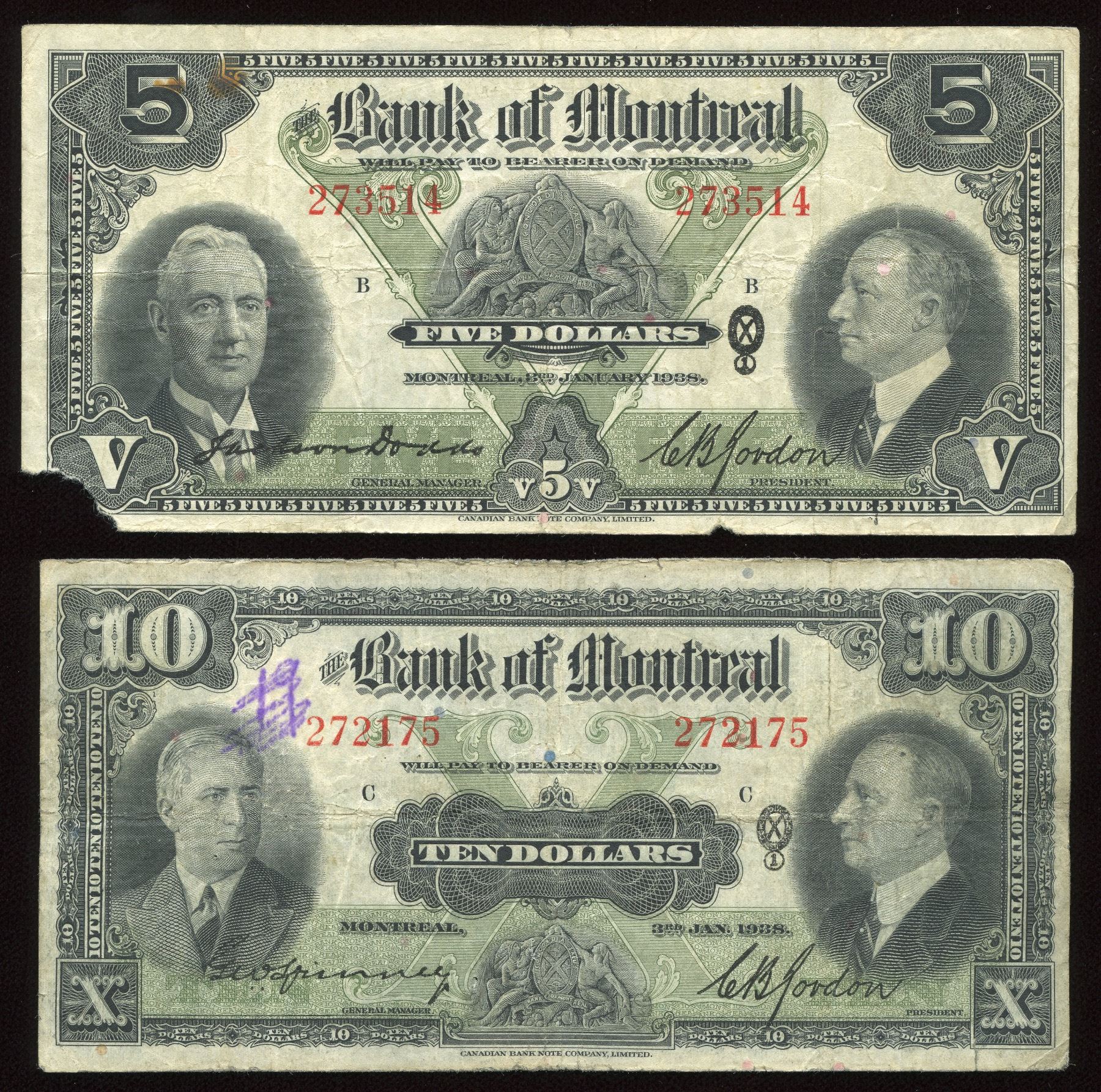 1938 $5 CH 495-62-02, 273514/B, VF+ rust spot and bottom left corner missing & $10 CH 495-62-04, VF with pen mark, Bank of Montreal 2 note lot