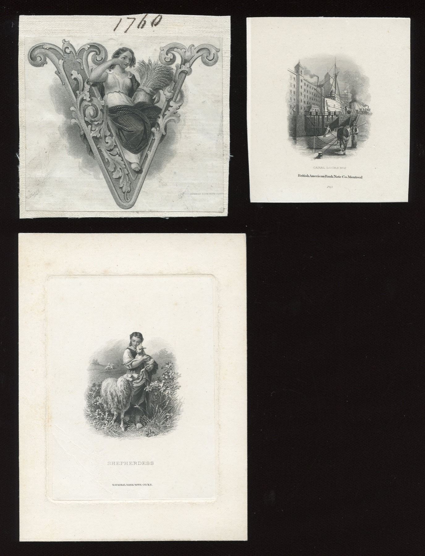 Bank of Ottawa, "Shepherdess" (1880 $5), another of the same but with title and National Bank Note imprint; "Canal Locks #2" (1903 $20). Banque du Peuple, similar to centre vignette on 1885 $5 but V is much darker. Four die proof vignettes.