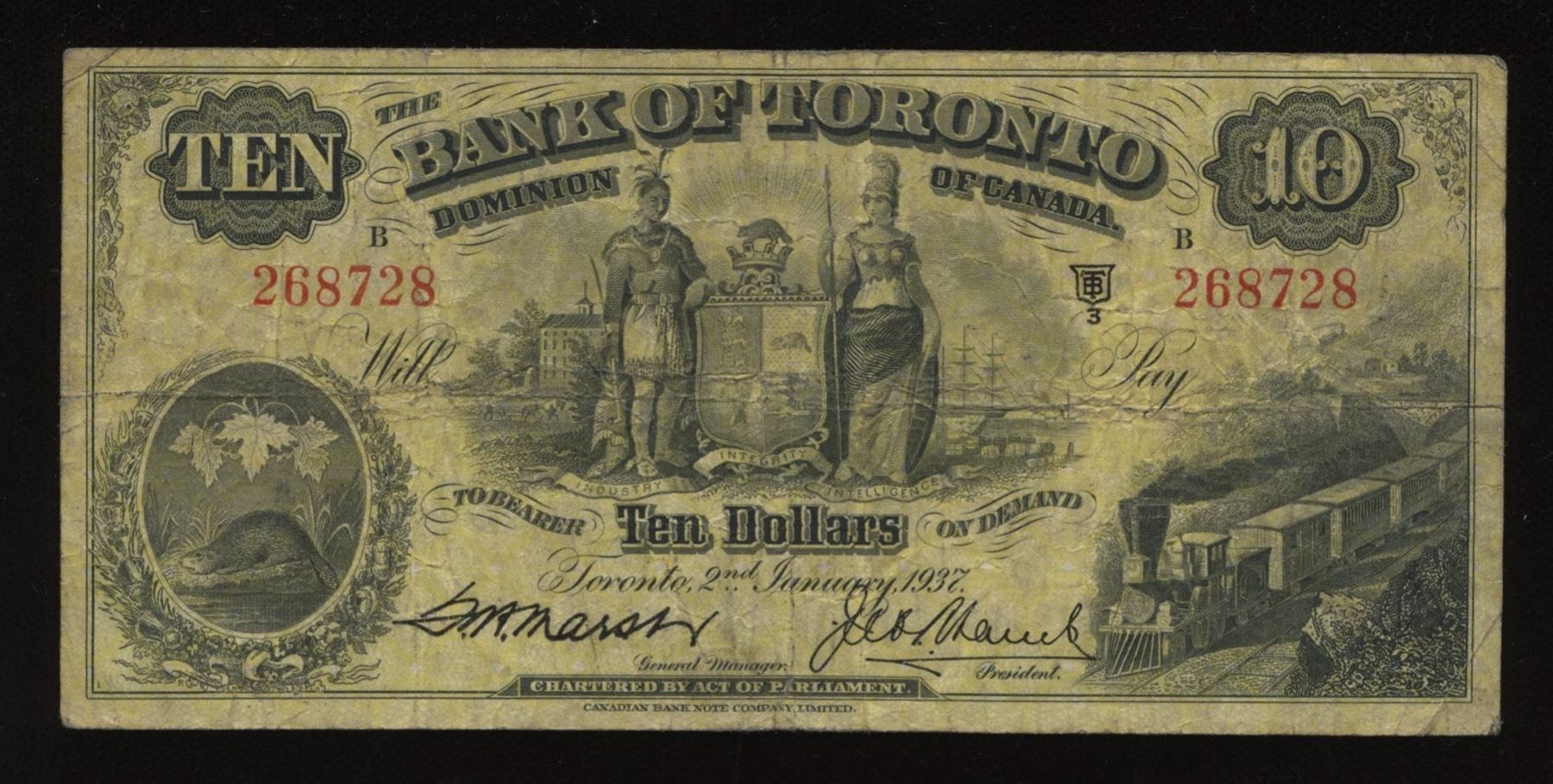 1937 The Bank of Toronto $10, CH 715-24-12, tougher Marsh signature, Fine, S/N 268728