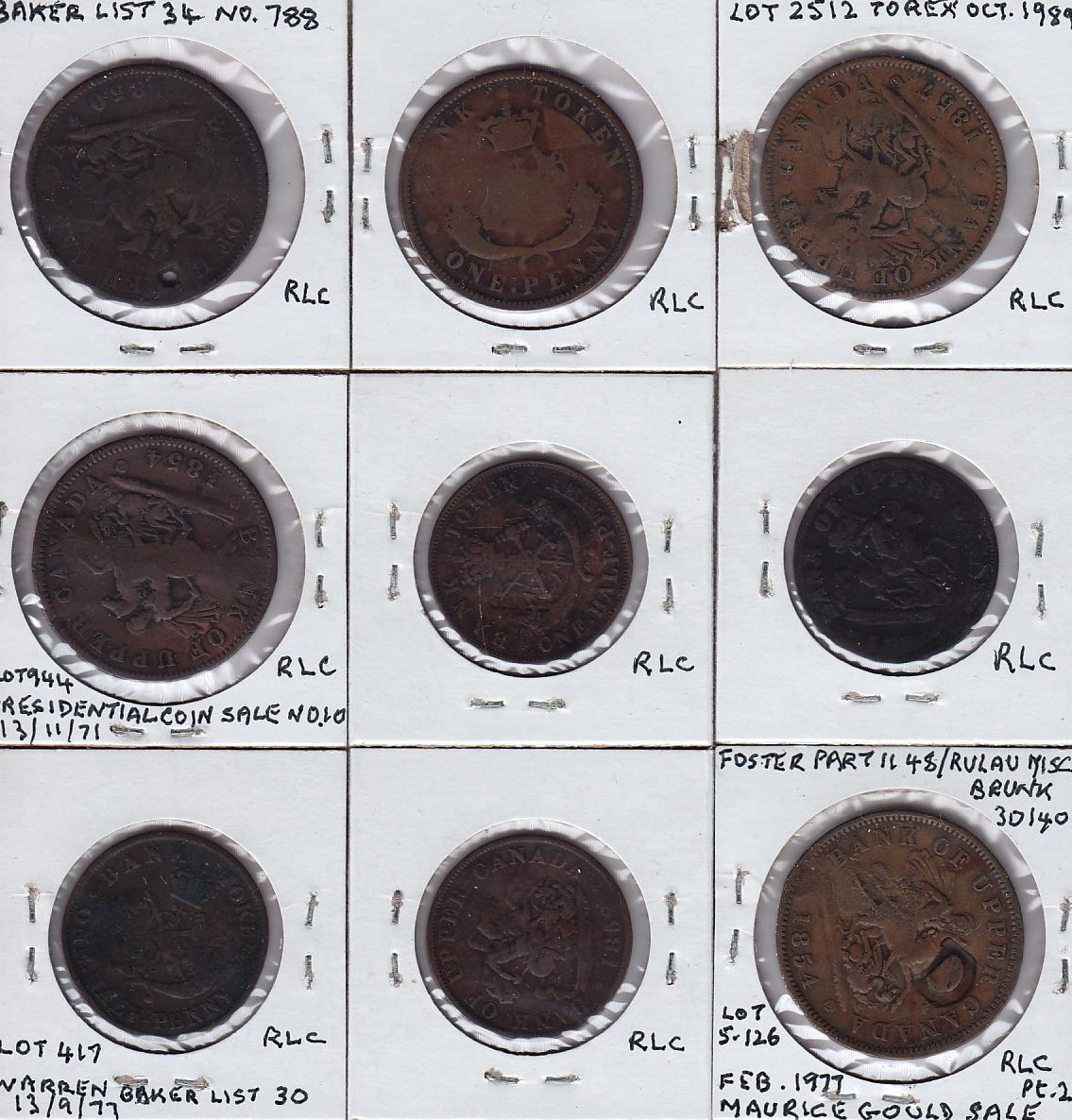 P. MYERS on rev. of Bank of Upper Canada penny, 1850, Br 719 (M.I. 677, cf. Brunk M-1036); N.B or N.R on obv. of Bank of Upper Canada penny, 1857, Br 719; N.L.M. three times on rev. of Bank of Upper Canada penny, 1857, Br 719 (M.I. 681); W. NICHOLS. on rev. of Bank of Upper Canada penny, 1854, Br 719 (M.I. 685, Brunk N-155); J. NYE on obv. & rev. of Bank of Upper Canada ½ penny, 1854, crosslet 4, Br 720 (M.I. 689); OO (or a pair of circles) on rev. of Bank of Upper Canada ½ penny, 1854?, Br 720 (M.I. 690); O•D on obv. of Bank of Upper Canada ½ penny, 1854, Br 720 (M.I. 691); O.H.L. on rev. of Bank of Upper Canada ½ penny, 1852, Br 720 (M.I. 692); OIL on rev. and D on obv. of Bank of Upper Canada penny, 1854, Br 719 (M.I. 703, Brunk O-56). 9 Pcs.